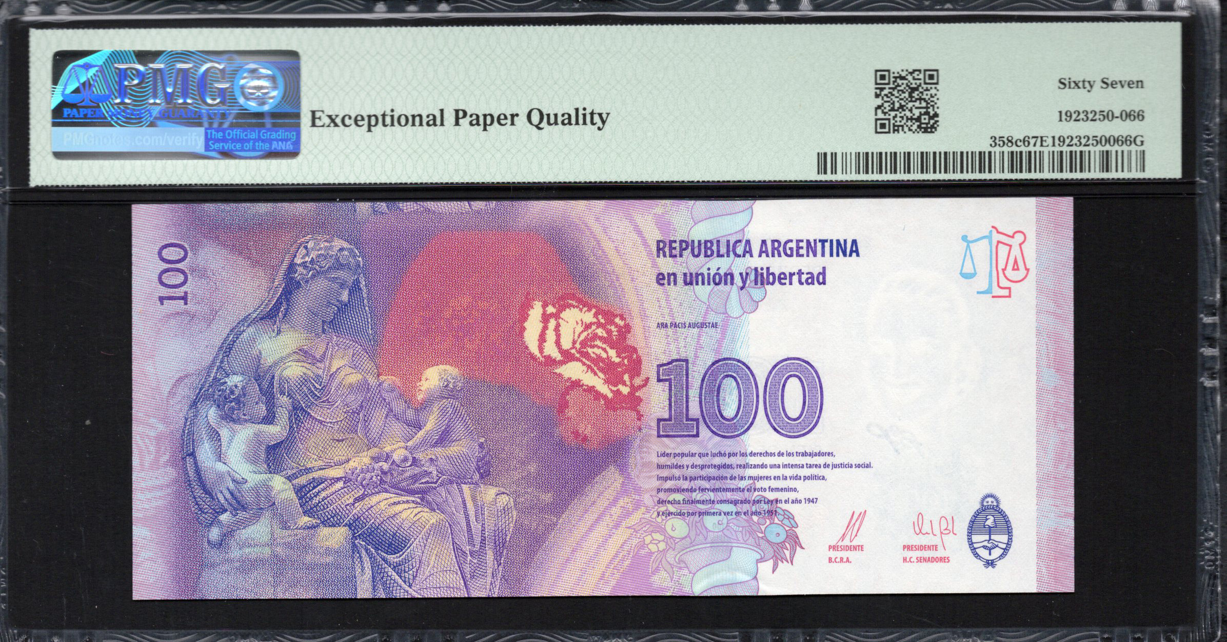 De voorzijde van het 100 Pesos biljet toont prominent het portret van Eva Perón, omringd door bloemmotieven die levendige kleuren zoals roze en groen integreren. De denominatie '100' is vetgedrukt en centraal, terwijl microtekst en een watermerk extra beveiliging bieden. De toevoeging van tactiele markeringen maakt het biljet toegankelijk voor visueel gehandicapten. Decoratieve elementen versterken de esthetiek en symboliseren de flora en rijke erfgoed van Argentinië.