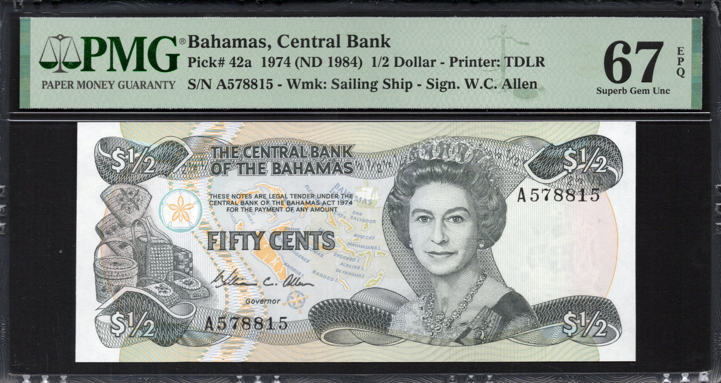 De voorzijde van het half-dollar bankbiljet toont prominent een gedetailleerd portret van koningin Elizabeth II, omringd door ingewikkelde ornamentale ontwerpen en golven die de oceaan symboliseren, wat essentieel is voor de Bahamaanse identiteit. De combinatie van zachte groene en gele tinten biedt een verfrissend uiterlijk, terwijl de denominatie duidelijk is gemarkeerd als 'Vijftig Cent.' Opvallende veiligheidskenmerken zijn onder andere fijne microprint en mogelijk een watermerk dat de authenticiteit verhoogt. Het bankbiljet is ook gemarkeerd met het serienummer A578815, wat helpt bij het identificeren van echte bankbiljetten.