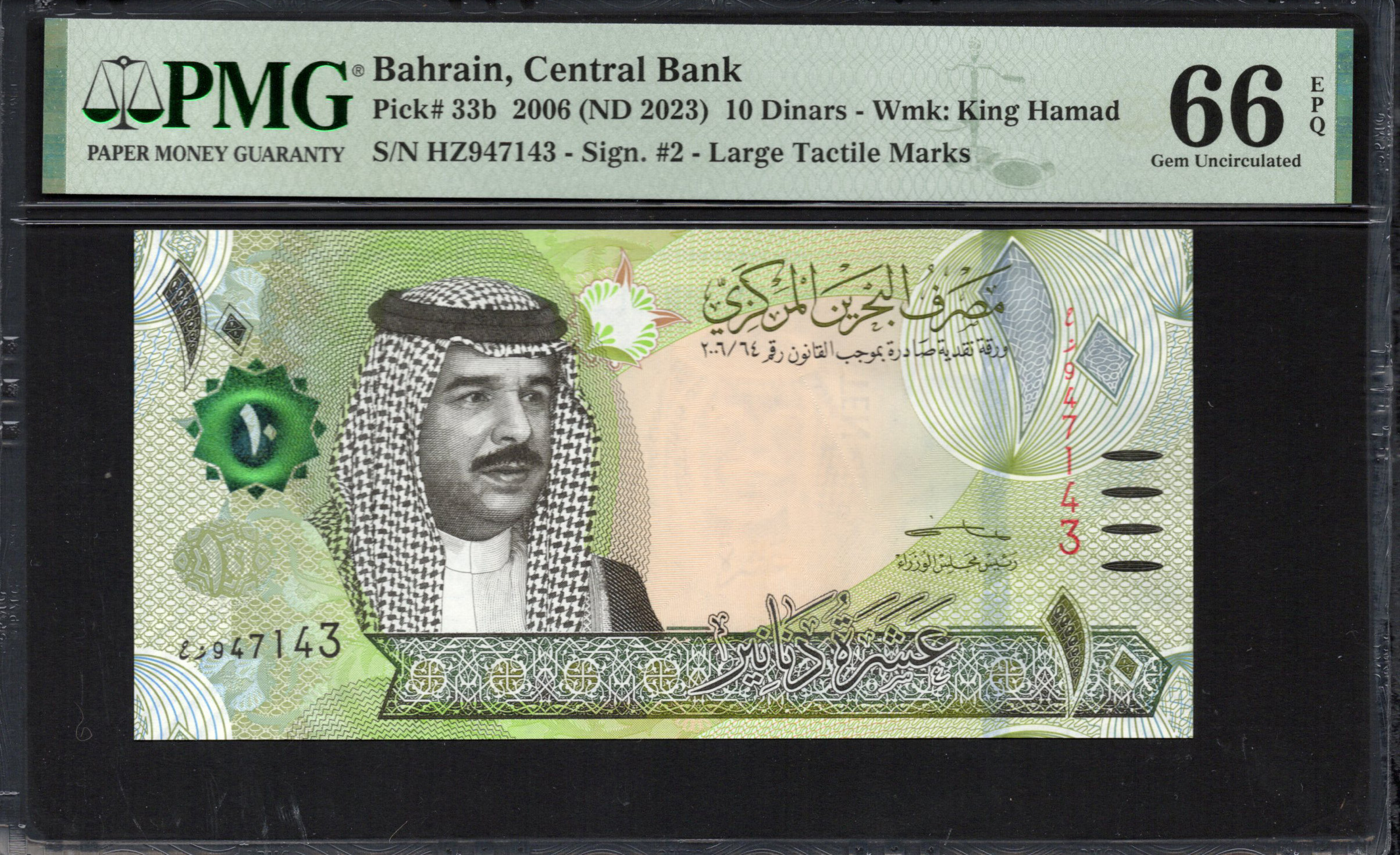 De voorzijde van het 10 Dinar bankbiljet toont prominent een portret van koning Hamad, weergegeven in elegante kleuren groen en goud, wat welvaart en stabiliteit symboliseert. Het gebruik van ingewikkelde patronen en textuurelementen verhoogt de artistieke aantrekkingskracht terwijl het ook dient als veiligheidskenmerken. Het watermerk met het beeld van de koning en microdruk zijn zichtbaar, wat essentieel is voor de preventie van vervalsing. Decoratieve motieven, waaronder lokale flora, zijn te zien, wat de culturele representatie verrijkt. Het bankbiljet heeft ook tastbare markeringen voor een betere toegankelijkheid.