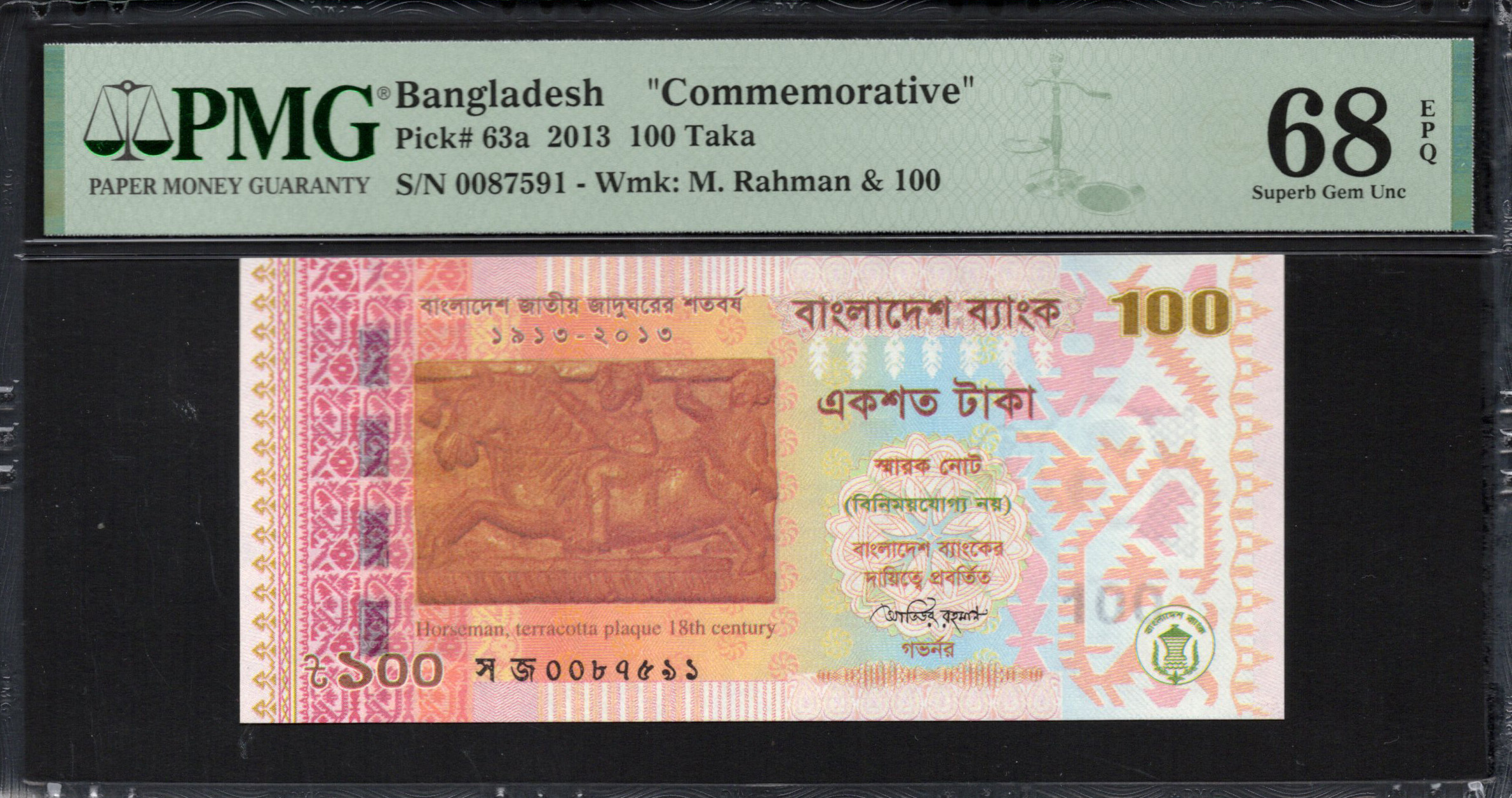Het 100 Taka bankbiljet uit Bangladesh, uitgegeven in 2013, toont een unieke mix van kunst en cultureel erfgoed. Dit herdenkingsbiljet benadrukt historische elementen door zijn ingewikkelde ontwerp. De voorzijde heeft een terracottaplaten uit de 18e eeuw, wat de rijke archeologische geschiedenis van Bangladesh symboliseert. De levendige kleuren en ornamentale patronen weerspiegelen de traditionele kunst van het land. Aan de achterzijde verbeelden verschillende elementen de culturele identiteit en natuurlijke schoonheid van het land, wat de esthetische aantrekkelijkheid vergroot. Het biljet beschikt ook over geavanceerde beveiligingskenmerken zoals watermerken en hologrammen om vervalsing te voorkomen. De PMG-certificering verhoogt de waarde als verzamelobject en als een belangrijk betaalmiddel in Bangladesh.