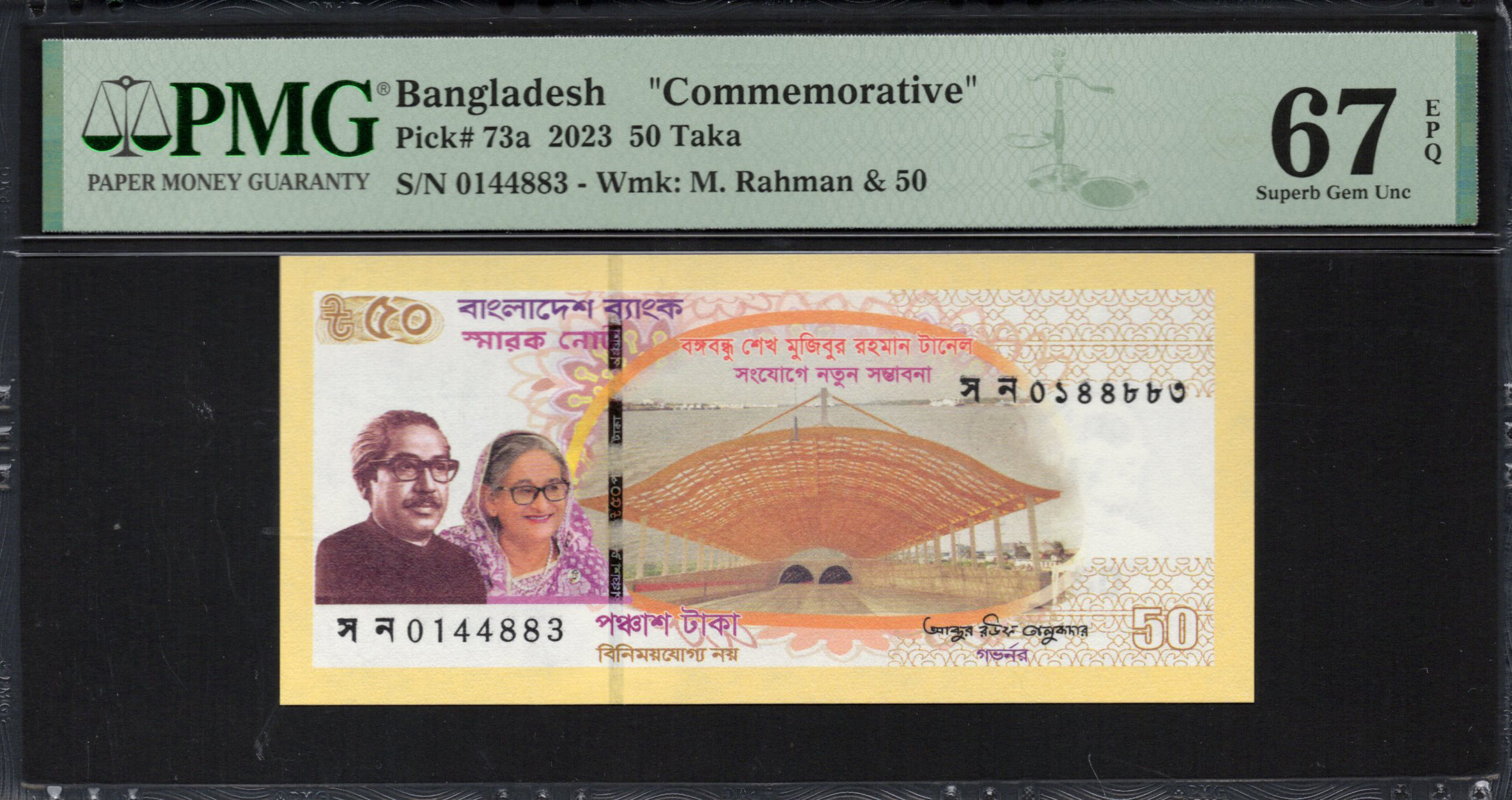 De voorzijde van het bankbiljet toont beelden van opmerkelijke personen, waarschijnlijk sleutelfiguren uit de Bengaalse geschiedenis, versierd met kleurrijke patronen en gedetailleerde portretten. De achtergrond kenmerkt zich door een mix van warme tinten, die artistieke motieven benadrukken die de rijke culturele erfgoed van het land vertegenwoordigen. Beveiligingskenmerken zoals een watermerk en microtekst kunnen ook zijn opgenomen om de echtheid te waarborgen en het biljet visueel te verrijken.