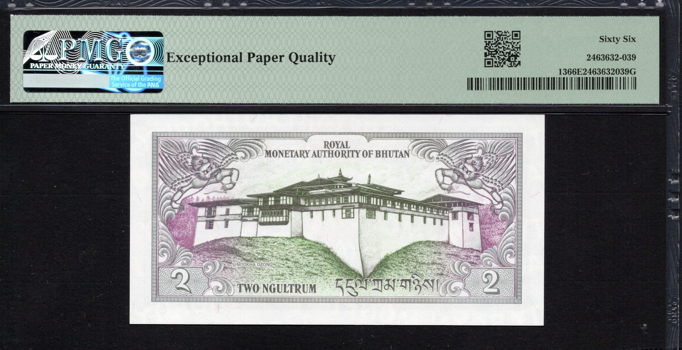 De voorzijde van het 2 Ngultrum bankbiljet is versierd met uitgebreide patronen met kleurrijke draken die zich om een centraal cirkelvormig embleem wikkelen. De draken zijn ingewikkeld ontworpen met levendige rood- en blauwtinten, die macht en bescherming in de Bhutanese cultuur symboliseren. De nominale waarde '2' is prominent weergegeven, naast unieke serienummers en artistieke versieringen. Opmerkelijke veiligheidskenmerken omvatten een watermerk en microtekst die de echtheid van het biljet waarborgen. Deze elementen combineren om een visueel opvallende vertegenwoordiging van de culturele identiteit van Bhutan te creëren.