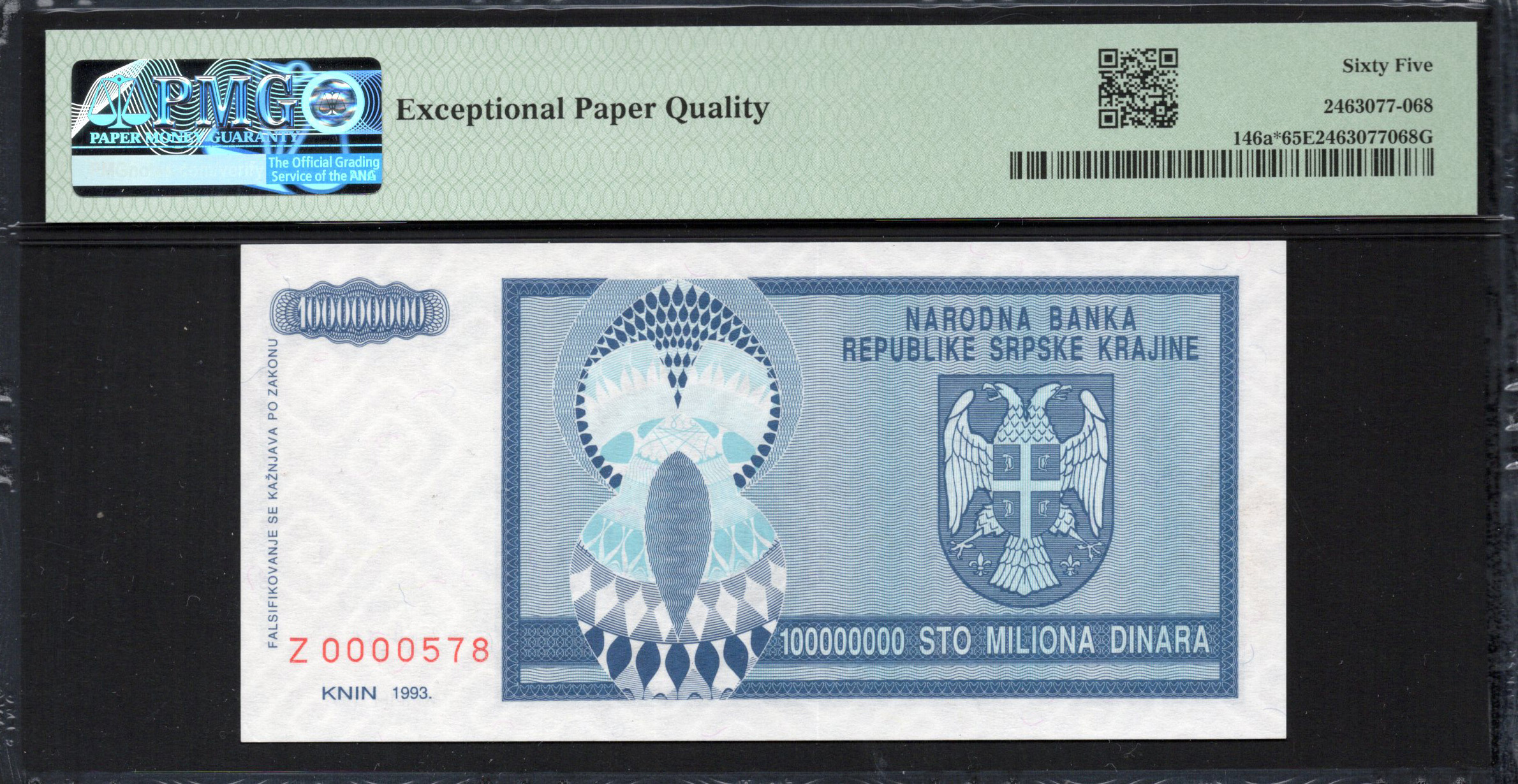De voorzijde van het 100 miljoen dinar bankbiljet is opmerkelijk blauw en toont het nationale embleem van Bosnië-Herzegovina, met twee gestileerde adelaars. Deze adelaars zijn belangrijke culturele symbolen die kracht en soevereiniteit vertegenwoordigen. De woorden "NARODNA BANKA" en "REPUBLIKE SRPSKE KRAJINE" zijn prominent weergegeven, wat de uitgevende autoriteit aangeeft. Het biljet bevat veiligheidskenmerken zoals een watermerk en fijne microtekst die zichtbaar worden wanneer je het kantelt, wat de anti-valsemunterijmaatregelen versterkt. De complexe ontwerpen rond het embleem bevatten decoratieve patronen die een artistieke touch toevoegen, wat de vakmanschap van de productie aantoont.
