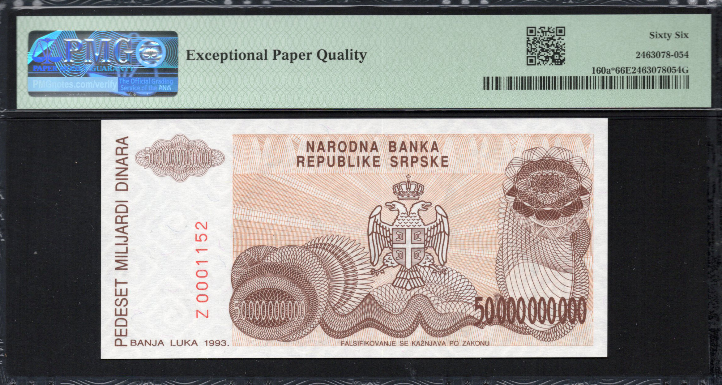 Dit bankbiljet uit Bosniƫ en Herzegovina bevat ingewikkelde ontwerpen en opmerkelijke veiligheidskenmerken. De niet-uitgegeven 50.000.000 dinar toont een historisch portret, ornamentale patronen en kleurgradaties die de authenticiteit en waarde benadrukken. De certificaatgradering geeft aan dat het in een ongebruikt staat verkeert, wat suggereert dat het niet in transacties is gebruikt. Met unieke elementen zoals watermerken en microprinting is deze valuta zowel een verzamelobject als een representatie van regionale geschiedenis.