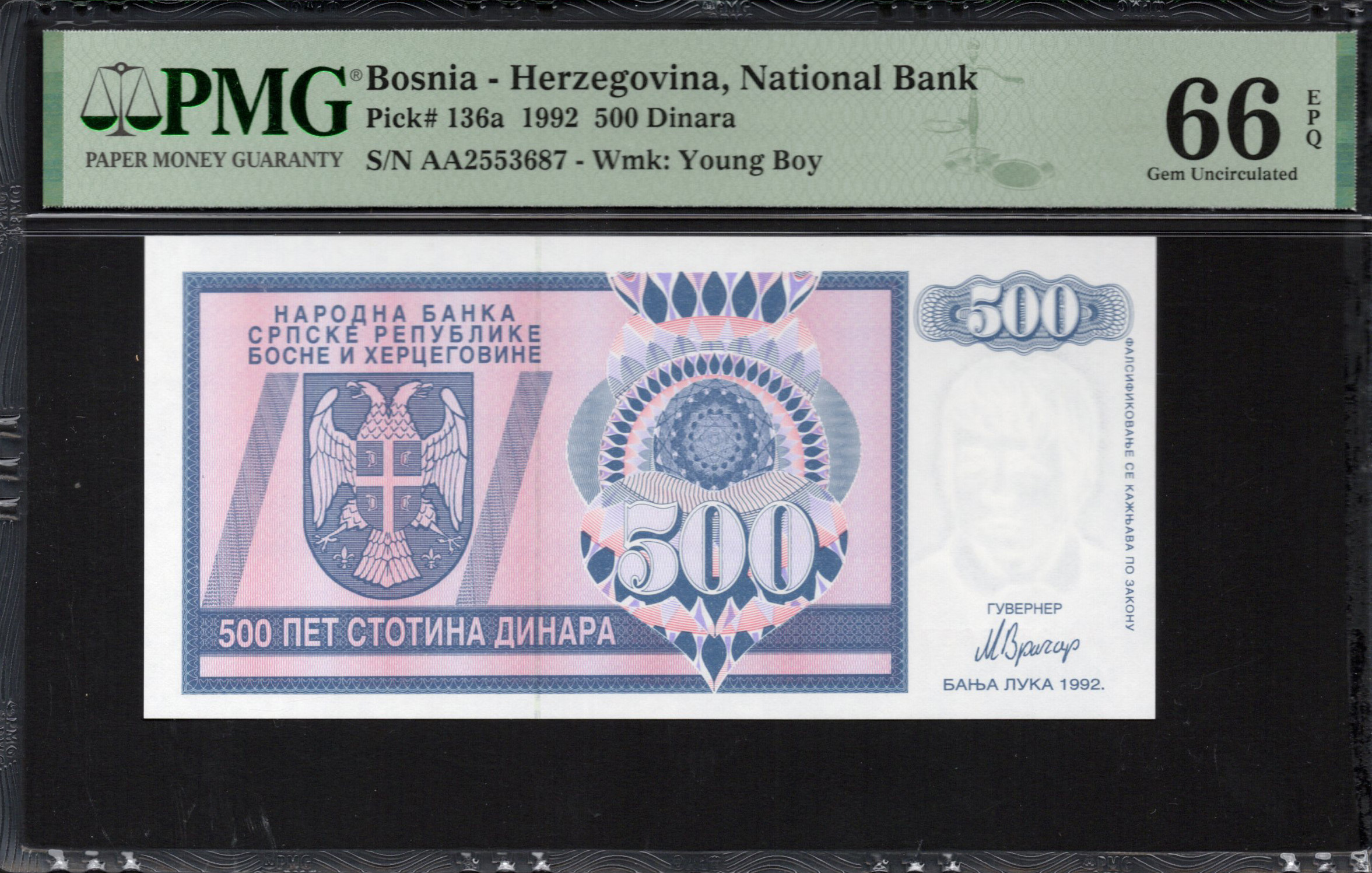 Op de achterzijde van het biljet zien we een ingewikkelde achtergrond met grote bloemmotieven en een cirkelpatroon dat de aandacht trekt. De waarde '500' is opnieuw prominent weergegeven, wat de herkenning van de waarde versterkt. Het kleurenschema van roze en felblauw wordt doorgezet, wat consistentie in het ontwerp biedt en de visuele aantrekkingskracht vergroot. Er zijn ook microteksten en andere veiligheidskenmerken om vervalsing tegen te gaan. Het subtiele vakmanschap in zowel ontwerp als veiligheidskenmerken onderstreept het belang van deze valuta in het afspiegelen van het economische en culturele landschap van Bosnië en Herzegovina tijdens een transformerende periode.