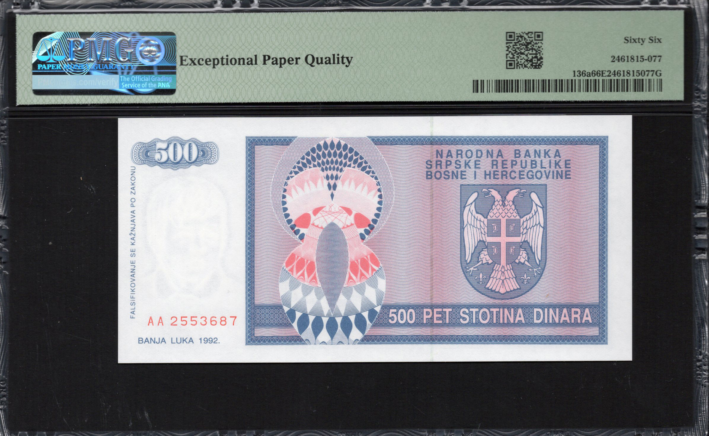 De voorzijde van het 500 dinar bankbiljet toont prominent het wapen van de Servische Republiek Bosnië en Herzegovina, met een gedetailleerde weergave van een adelaar. De achtergrond is gekarakteriseerd door ingewikkelde roze en blauwe bloemmotieven en geometrische vormen, wat een artistiek tintje geeft. De prominente waarde '500' is gemakkelijk leesbaar, wat het gebruiksgemak vergroot. Bovendien bevat het bankbiljet hedendaagse veiligheidskenmerken zoals microprinten, wat de authenticiteit garandeert en het risico op vervalsingen verlaagt. Het ontwerp weerspiegelt culturele betekenis en maakt het niet alleen een ruilmiddel, maar ook een stuk nationale erfgoed.