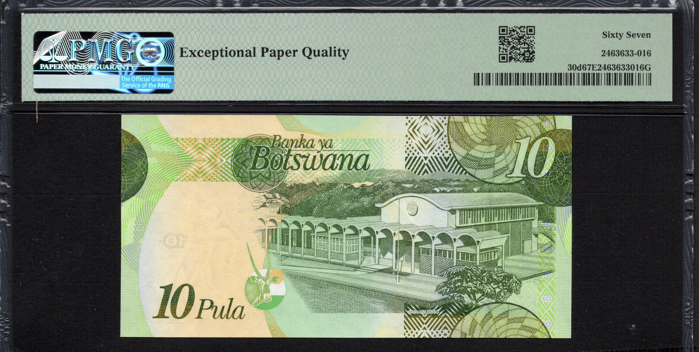 De achterzijde van het bankbiljet heeft een onderscheidend ontwerp dat traditionele elementen benadrukt, waaronder een embleem dat het dierenleven en de culturele erfgoed van Botswana vertegenwoordigt. De kleuren verlopen naar zachtere gradaties, waarbij het nummer '10' opnieuw prominent in beeld is. Opmerkelijk is de aanwezigheid van een holografisch element dat de beveiliging vergroot en een tastfunctie biedt voor visueel gehandicapte gebruikers om het biljet te identificeren. Deze zijde viert de diversiteit van de natuur van Botswana, integrerend symbolische weergaven van de rijke milieu-geschiedenis van het land, en versterkt daarmee de nationale trots die in deze valuta is vervat.