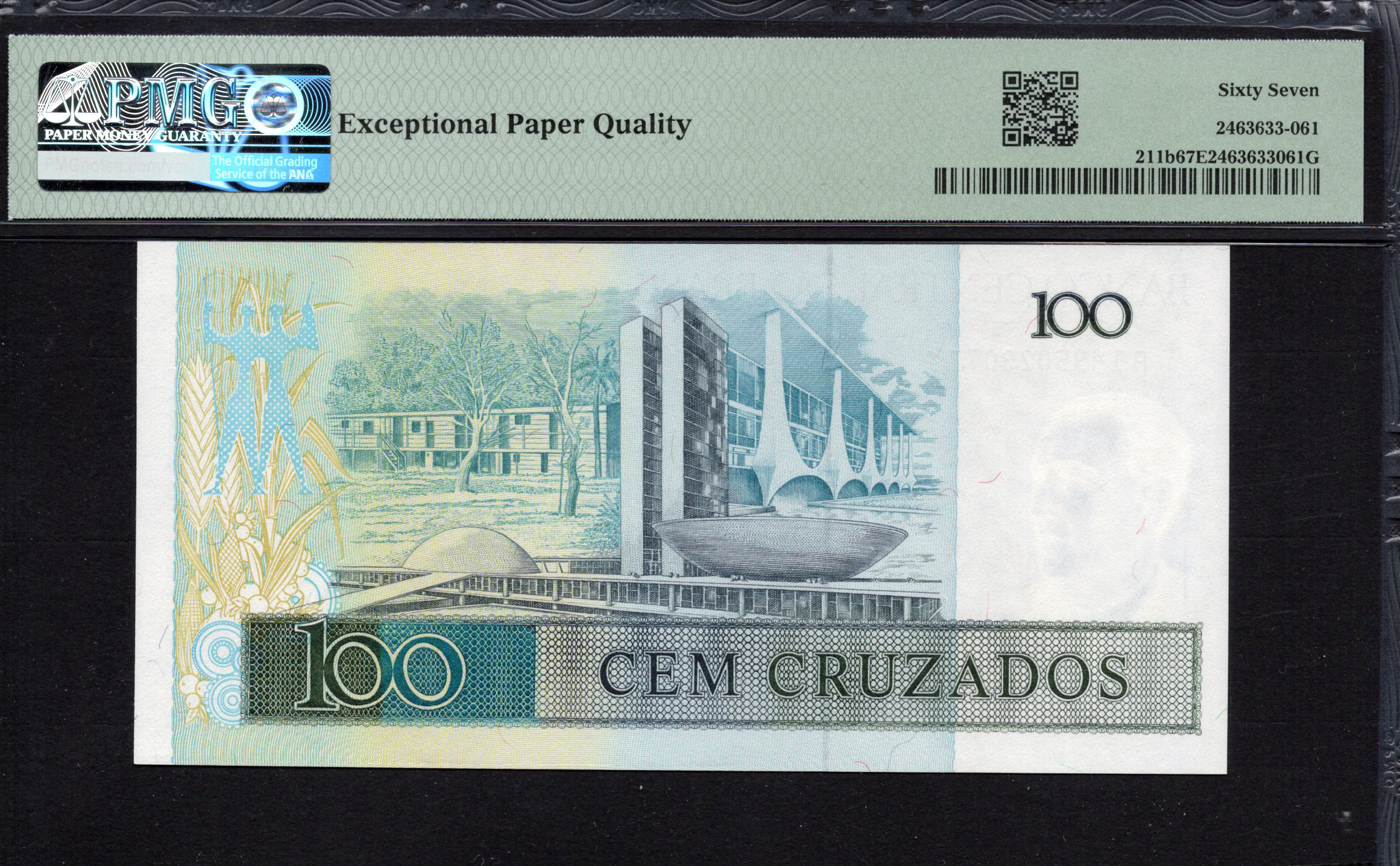 De voorzijde van het 100 Cruzados bankbiljet toont een prominent portret van een opvallende persoon, waarschijnlijk een belangrijke figuur in de Braziliaanse geschiedenis. Rondom het portret is een ingewikkeld ontwerp opgenomen dat elementen van het Braziliaanse landschap bevat, waaronder architecturale motieven en regionale representaties. Het kleurenschema bestaat uit lichte blues en gele tinten, wat het een levendige maar verfijnde uitstraling geeft. Zichtbare veiligheidskenmerken omvatten een watermerk, microtekst en mogelijk een holografisch element ter bescherming tegen vervalsingen. Over het geheel genomen tonen de artistieke details en veiligheidsmaatregelen de betekenis en waarde van het biljet aan.