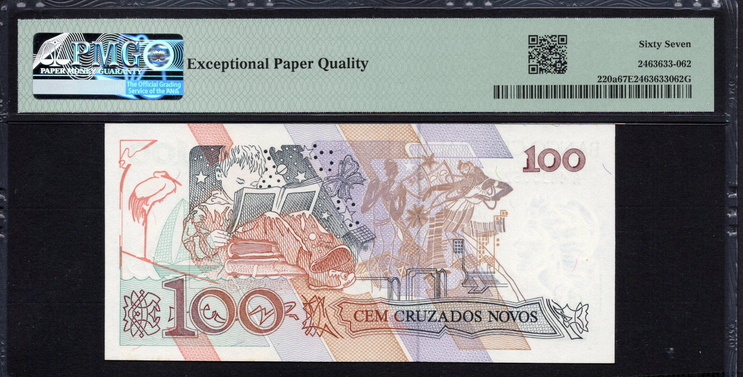 De voorkant van het 100 Cruzeiros Novos bankbiljet wordt gedomineerd door het portret van een vrouwelijke figuur die Vrijheid vertegenwoordigt. De achtergrond is versierd met levende kleuren zoals groen, oranje en paars, wat een visueel aantrekkelijk contrast creëert. Decoratieve elementen verweven met bloemmotieven benadrukken de verbinding met de natuur. Veiligheidskenmerken zoals microtekst en watermerken zijn zichtbaar en waarborgen de authenticiteit van het bankbiljet. De vetgedrukte '100' die prominent is gedrukt, onderstreept de waarde en verbetert de algehele samenstelling.