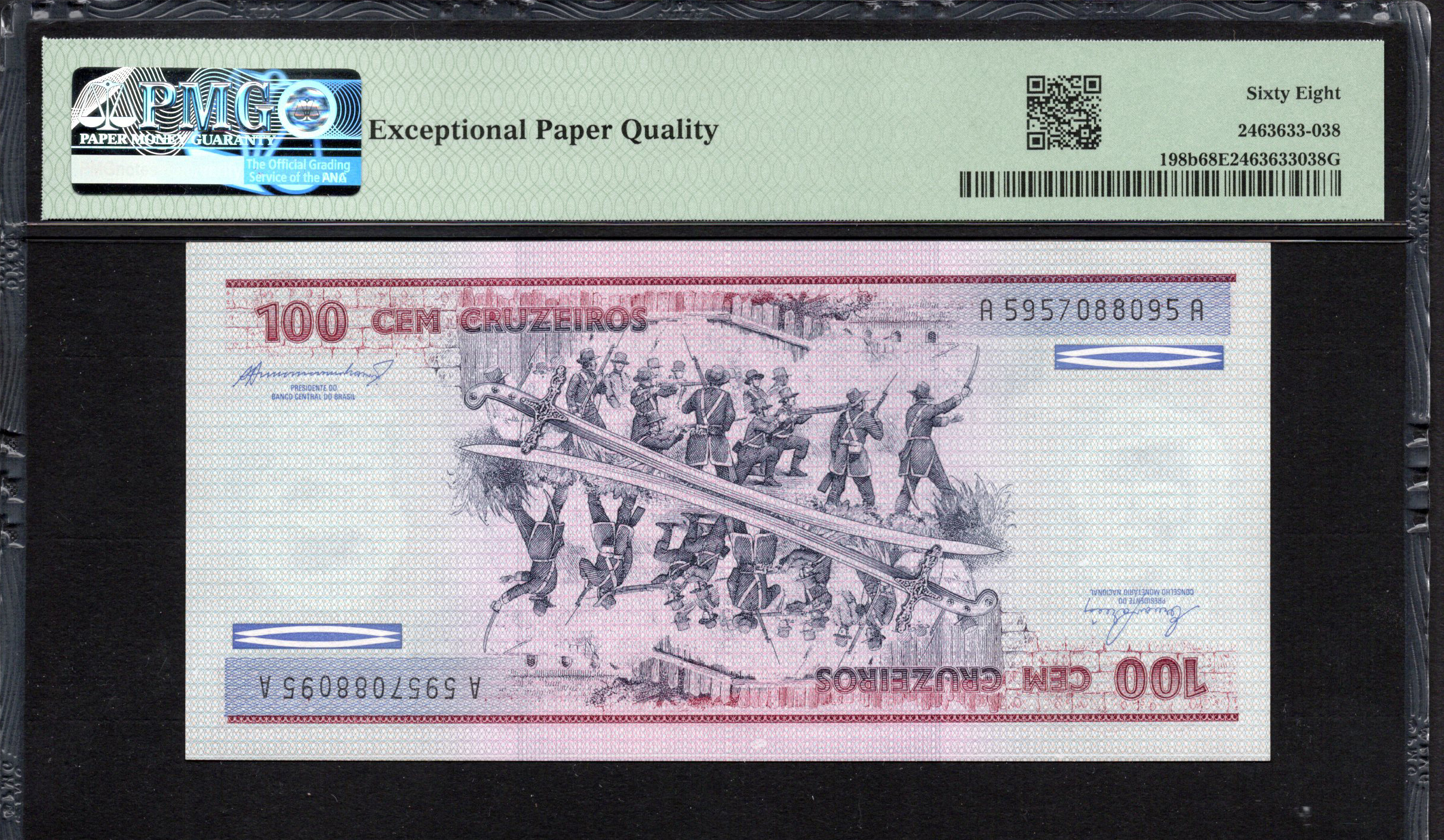 De achterkant van het bankbiljet aanvult de voorkant met een vergelijkbaar kleurenschema en ontwerpelementen. De lay-out bevat een mix van patroonafdrukken en aanvullende beveiligingsmaatregelen, zoals microtekst die moeilijk te repliceren is. Het bevat ook belangrijke inscripties en de nominale waarde. De algehele visuele stijl houdt zich aan de culturele motieven en geschiedenis van Brazilië, waardoor het esthetische aantrekkingskracht krijgt terwijl het een functioneel doel dient in het onderscheiden van vervalste biljetten.