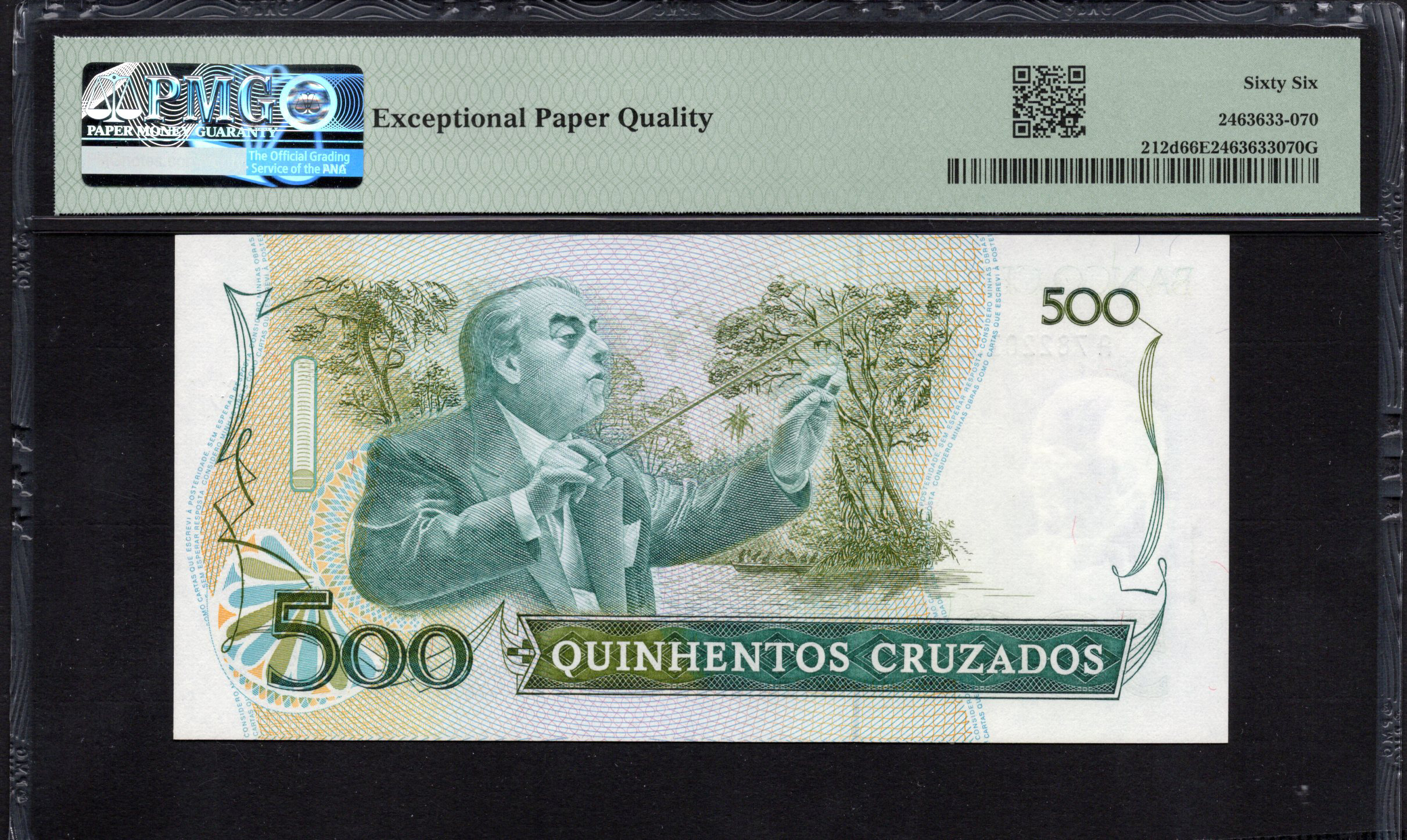 De achterzijde toont een artistieke voorstelling van de natuur, die aansluit bij de thema's van Braziliaanse identiteit en erfgoed. Kleurnuances vloeien soepel in elkaar over, gebruikmakend van groen- en aardetinten om de biodiversiteit van het land te weerspiegelen. Informatie zoals de nominale waarde '500' en de tekst 'QUINHENTOS CRUZADOS' worden prominent weergegeven, om duidelijkheid te waarborgen. Bovendien zijn verschillende veiligheidskenmerken in het ontwerp geïntegreerd, waaronder hologrammen, die bijdragen aan de duurzaamheid en bescherming van het bankbiljet tegen vervalsing. Deze zijde van het bankbiljet versterkt daardoor zowel de educatieve als esthetische waarde.