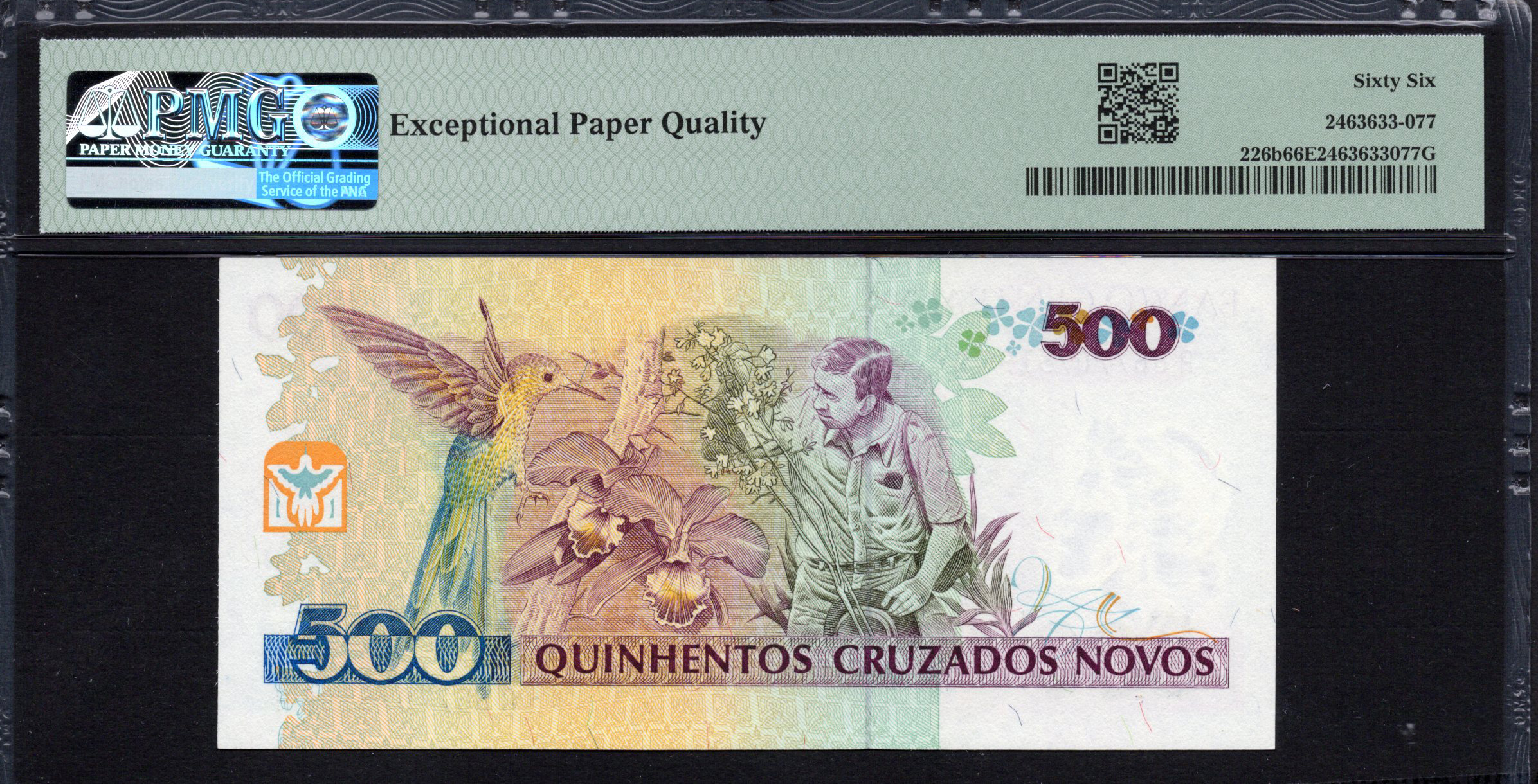 De voorkant van het 500 Cruzeiros bankbiljet toont prominent een gedetailleerd portret van Augusto Ruschi, omringd door levendige kleuren van groen, oranje en paars. De denominatie '500' is duidelijk afgebeeld, wat zorgt voor onmiddellijke herkenning. De achtergrond bestaat uit ingewikkelde patronen, wat een artistieke flair toevoegt die de aandacht trekt. Opvallend is het watermerk van Ruschi dat ook zichtbaar is en de veiligheidskenmerken van het biljet versterkt. Het gebruik van microtekst en een transparante venster biedt extra lagen bescherming tegen vervalsing.