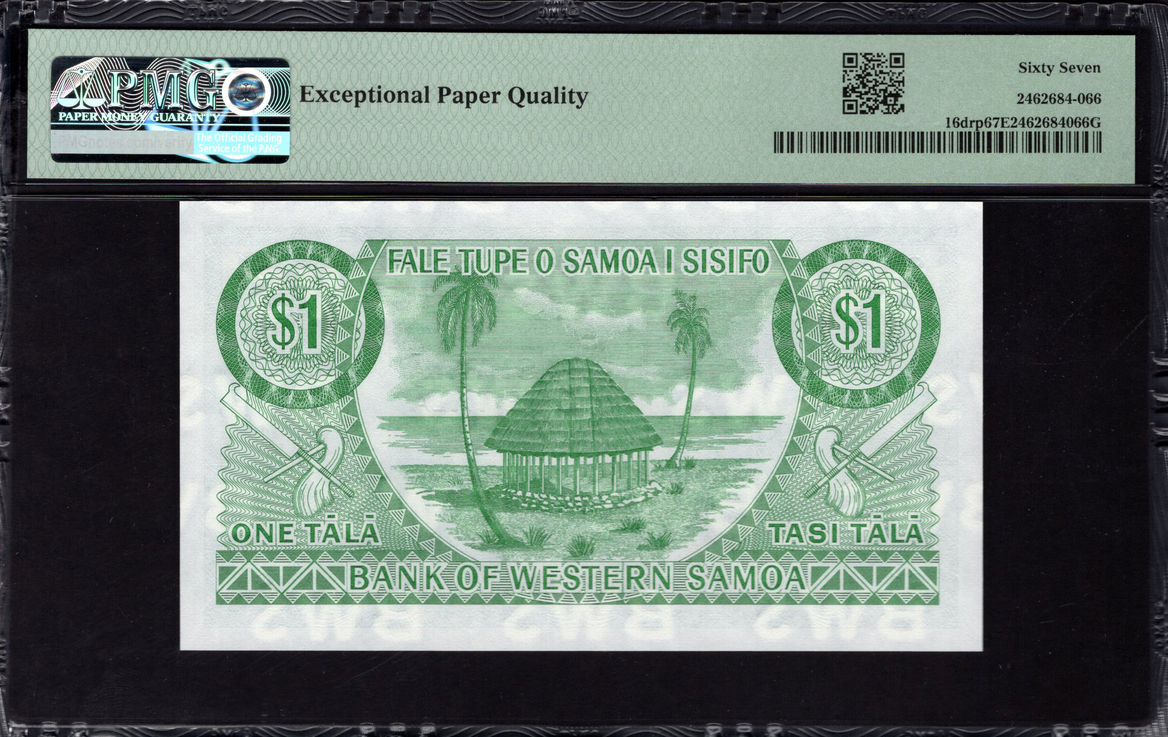 Het $1 bankbiljet van Samoa heeft levendige groene tinten en intrigerende ontwerpen die de rijke culturele erfgoed van het eiland weerspiegelen. De voorzijde toont een gedetailleerd embleem dat het land symboliseert, met decoratieve patronen en de duidelijk weergegeven denominatie. Veiligheidselementen omvatten een watermerk en microtekstprints die de authenticiteit waarborgen. De afbeelding van traditionele symbolen benadrukt de verbinding met de Samoaanse identiteit en trots. Aan de achterzijde benadrukt een sereen tafereel van lokale vissers in een boot het belang van de visserij in de Samoanse cultuur, omringd door weelderige landschappen. Deze artistieke en functionele elementen maken dit bankbiljet niet alleen tot valuta, maar tot een kunstwerk.