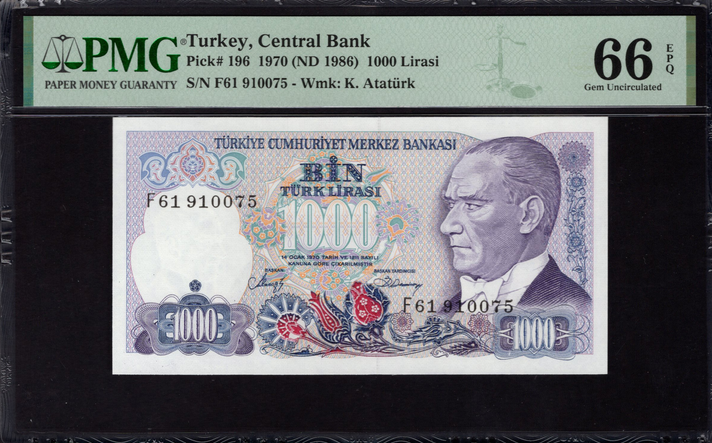 De voorzijde van het 1000 Lira bankbiljet toont een gedetailleerd portret van Mustafa Kemal Atatürk, omgeven door ornate decoratieve elementen. Het kleurenpalet bevat tinten paars, blauw en roze, wat de ontwerpelementen tot leven brengt. De denominatie is prominent weergegeven in ingewikkelde kaders, waarbij het nummer '1000' in een groter lettertype wordt benadrukt. Links is er een microgeprinte sectie die de veiligheidskenmerken versterkt. Bovendien beschikken de achtergrond en de decoraties over bloem- en geometrische patronen die naadloos in het geheel passen, waardoor het biljet visueel opvallend is.