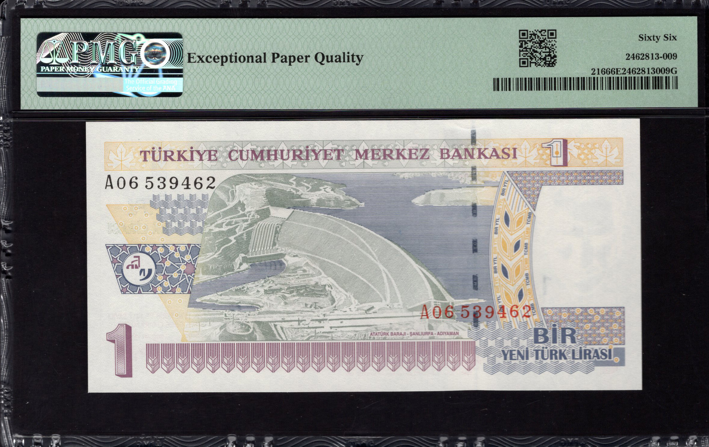 De voorzijde van het 1 Nieuwe Lira bankbiljet toont een portret van Mustafa Kemal Atatürk, die charisma uitstraalt met zijn strenge maar benaderbare uitstraling. Het gebruik van kleuren, voornamelijk lichte rozen- en diepe roodtinten, creëert een zachte maar gedurfde indruk. Geometrische patronen en het cijfer '1' in grote letters versterken de visuele impact. Belangrijke inscripties zoals 'BİR' en 'YENİ TÜRK LİRASI' bevestigen de denominatie. Veiligheidskenmerken zoals een watermerk en microtekst zijn geïntegreerd om vervalsing te voorkomen, wat extra diepte aan het ontwerp toevoegt.