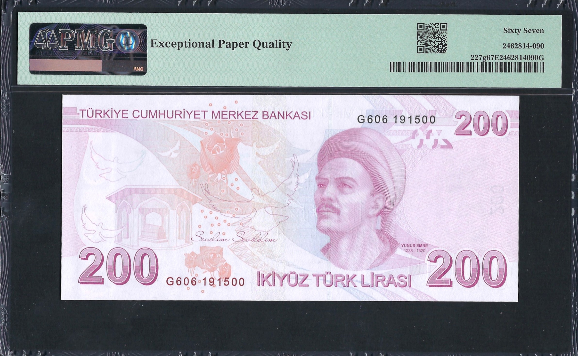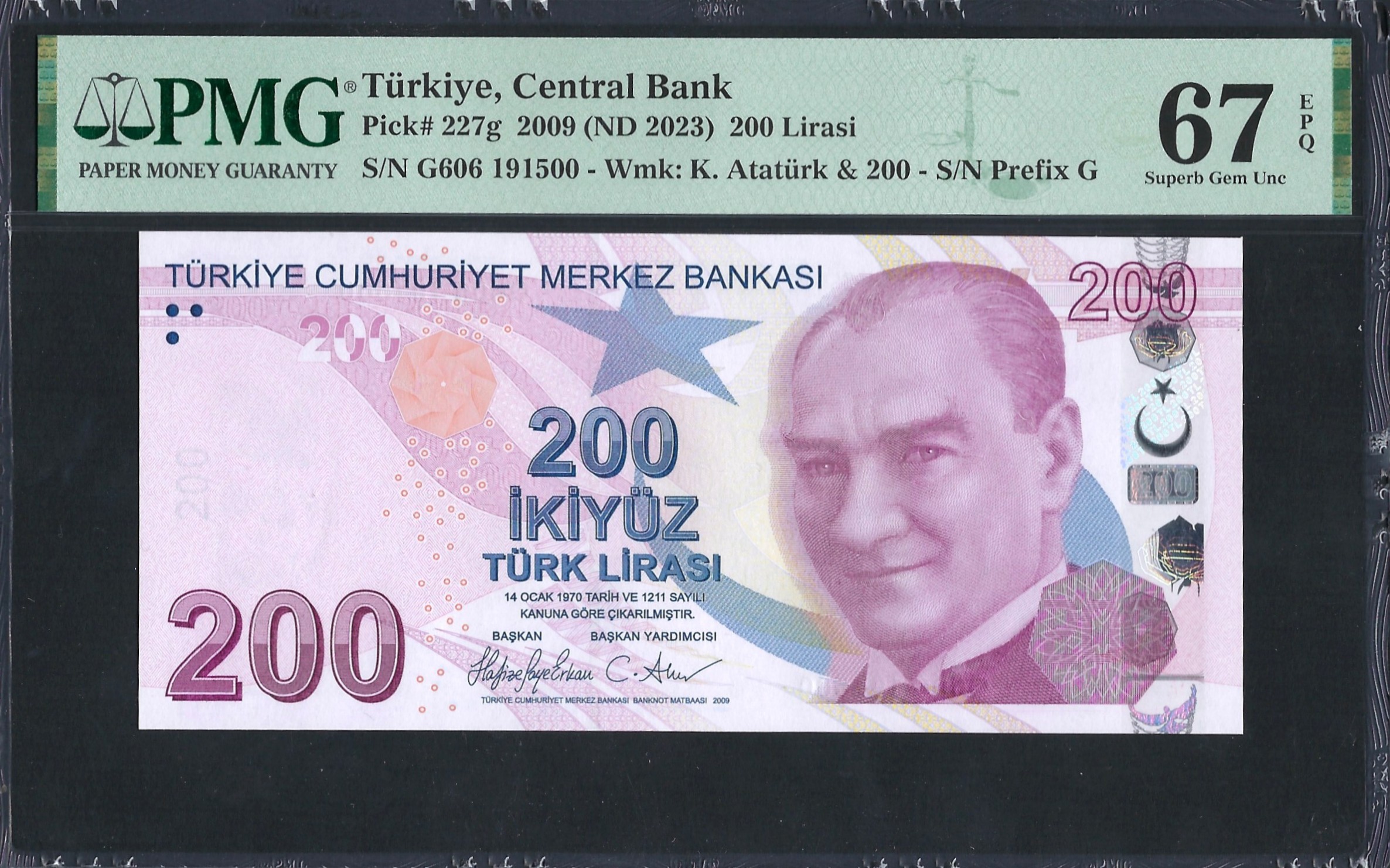 Het 200 Lira bankbiljet van Turkije combineert historische betekenis met moderne ontwerpkenmerken. Gedomineerd door tinten roze en verschillende geometrische patronen, bevat het beveiligingselementen zoals een watermerk en microtekst. Er is veel aandacht besteed aan het weerspiegelen van het culturele erfgoed van Turkije, terwijl duurzaamheid en het voorkomen van vervalsingen gewaarborgd zijn. De voorzijde toont prominent Mustafa Kemal Atatürk, een sleutelpersoon in de Turkse geschiedenis, en symboliseert de oprichting van de republiek. De achterkant gaat verder met dit thema en bevat abstracte ontwerpen en thematische elementen die verband houden met de identiteit van Turkije.