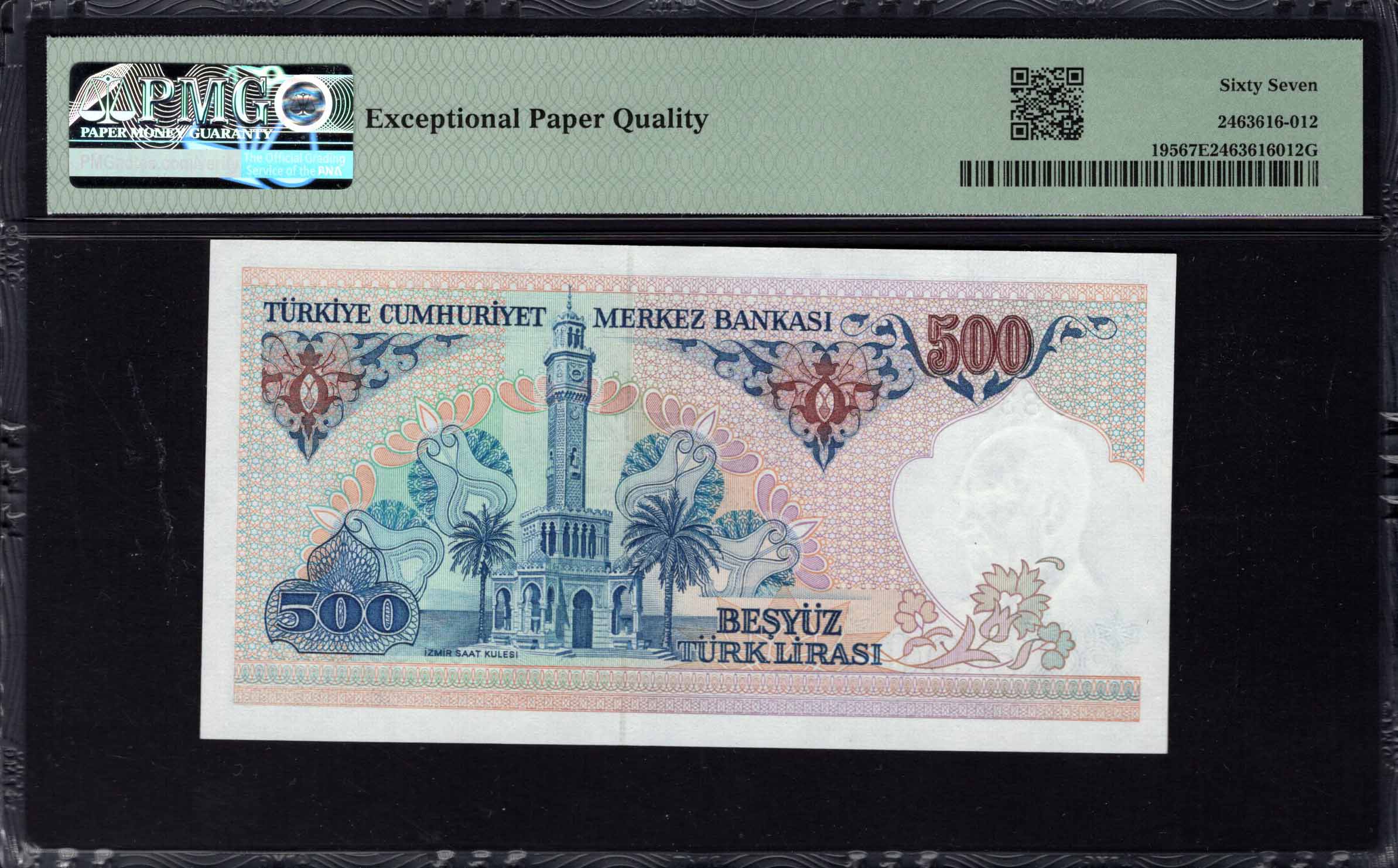 De voorkant van het 500 Lira bankbiljet toont prominent een gedetailleerd portret van Mustafa Kemal Atatürk in profiel, wat kenmerkend is voor Turkse bankbiljetten. De achtergrond heeft ingewikkelde, vloeiende ontwerpen in tinten blauw met florale accenten, die de betrokkenheid van kunst weerspiegelen. De denominatie is duidelijk aangegeven als '500', en het biljet bevat belangrijke teksten zoals 'Türkiye Cumhuriyet Merkez Bankası', die de officiële status bevestigen. Beveiligingskenmerken zoals een watermerk en microprinting-elementen vergroten de authenticiteit, waardoor het moeilijk is om het frauduleus te reproduceren.