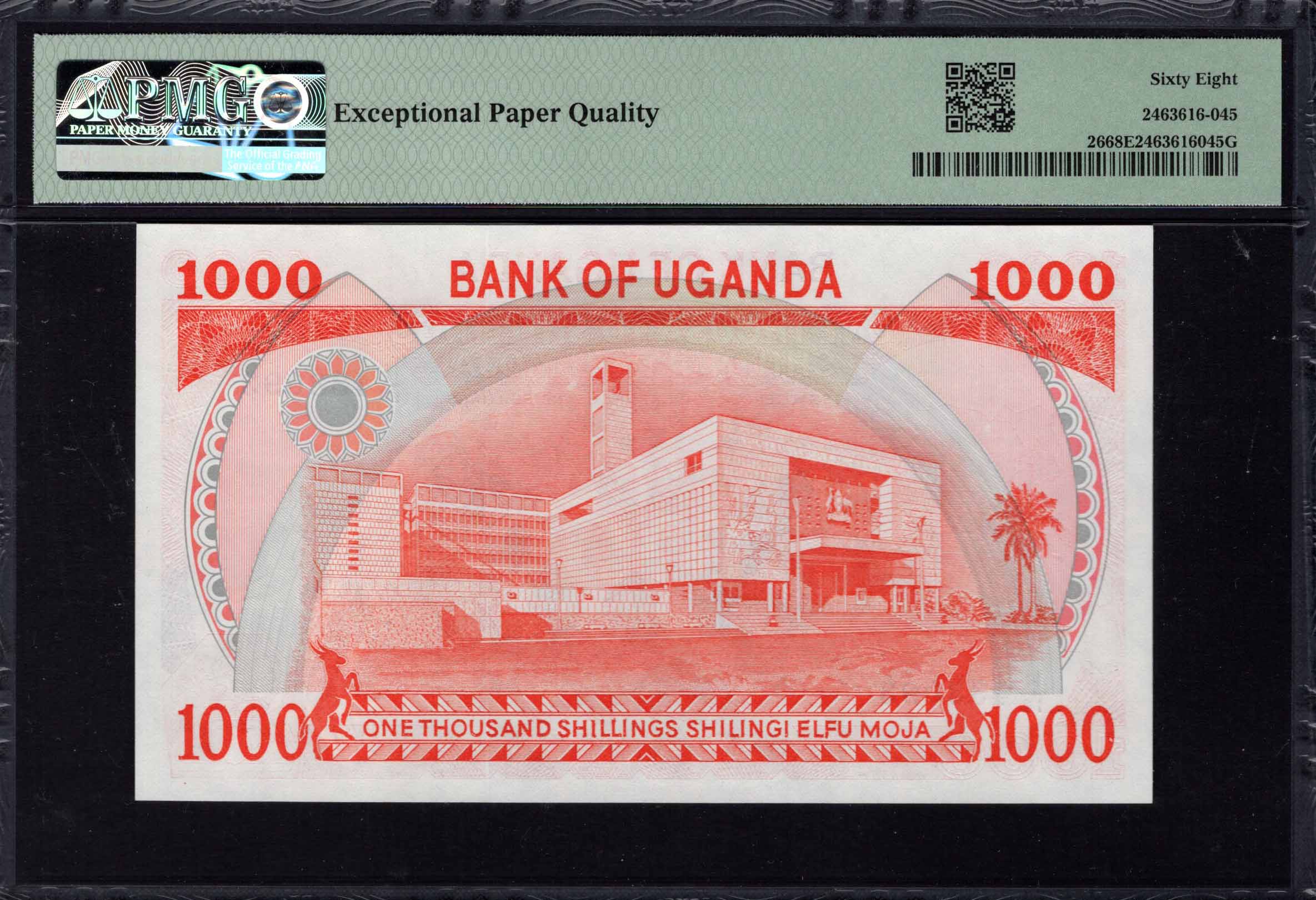 Het 1000 shillings bankbiljet van Uganda, uitgegeven door de Bank of Uganda in 1986, is een opvallend voorbeeld van lokale valutaontwerp dat levendige kleuren en nationale symboliek integreert. De voorzijde toont een afbeelding van de Kranen, een belangrijk symbool van Uganda, samen met het nationale wapenschild. Het biljet is voornamelijk rood en bevat ingewikkelde patronen en microtekst om de veiligheid te verbeteren. Het ontwerp weerspiegelt zowel culturele erfgoed als moderne veiligheidskenmerken, waardoor het een uniek exemplaar van papiergeld is.