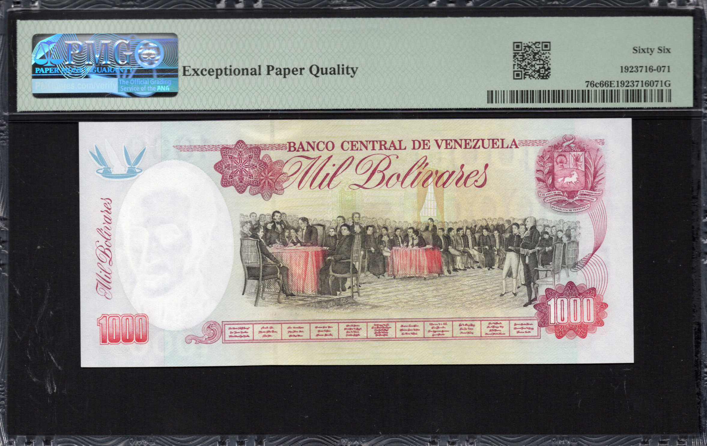 De voorzijde van het 1000 Bolívares bankbiljet toont prominent een afbeelding van Simón Bolívar, een iconische leider in de geschiedenis van Latijns-Amerika. Zijn afbeelding is omringd door een rijk palet van kleuren, waaronder tinten roze en paars, wat een gevoel van dynamiek oproept. De numerieke waarde van '1000' is op verschillende plaatsen opvallend gedrukt, wat de zichtbaarheid garandeert. Bovendien bevatten de ingewikkelde achtergrondontwerpen patronen die diepte toevoegen, terwijl veiligheidskenmerken zoals een watermerk subtiel zijn geïntegreerd, waardoor het biljet zowel esthetisch aantrekkelijk als veilig is.