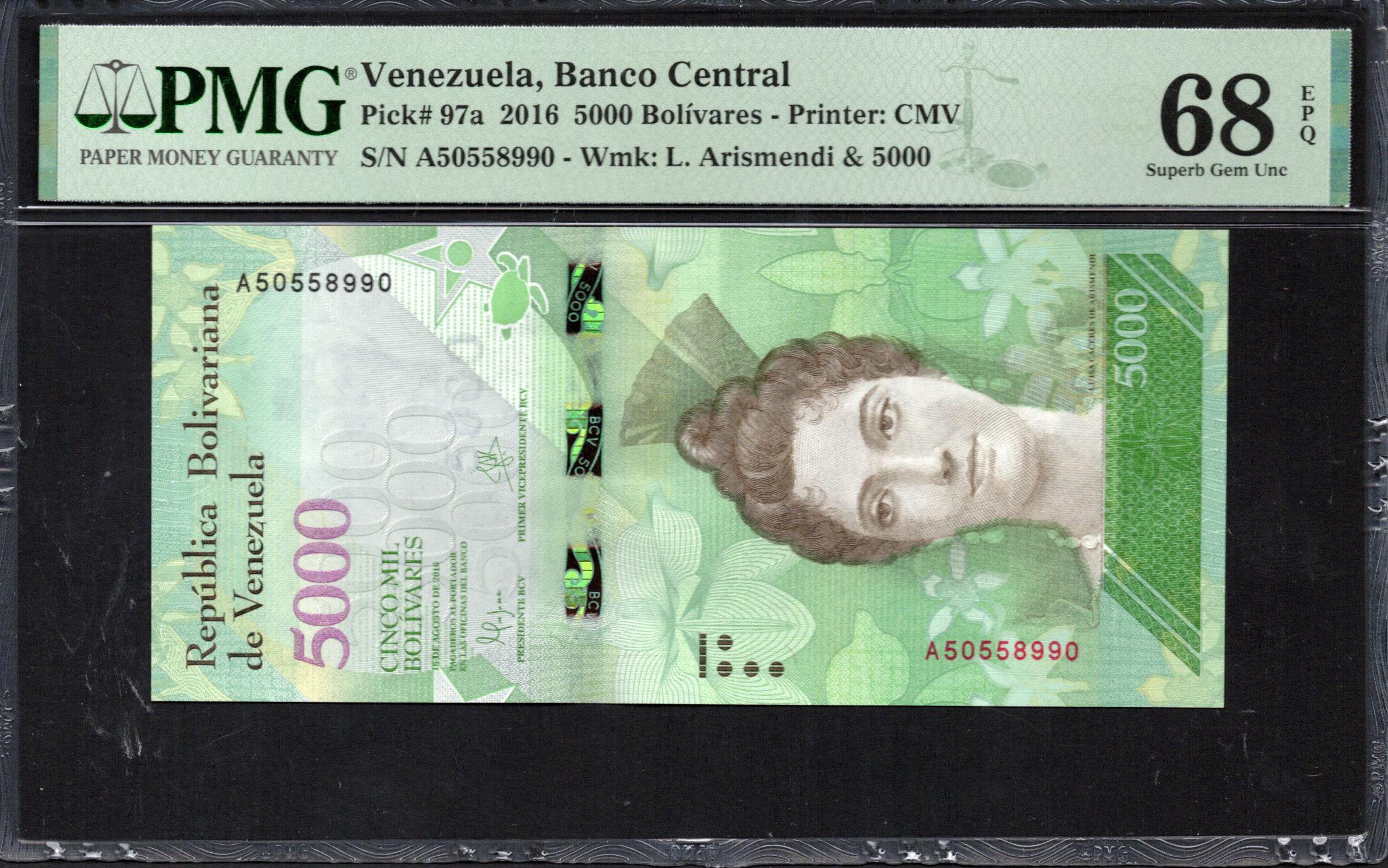 Het Venezolaanse bankbiljet van 5000 Bolívares, uitgegeven in 2016, heeft levendige kleuren en complexe ontwerpen die de cultuur en natuurlijke schoonheid van het land weerspiegelen. De voorkant toont een prominent portret van Simón Bolívar, een sleutelfiguur in de bevrijding van Latijns-Amerika, tegen een achtergrond van weelderige groene patronen geïnspireerd door de rijke flora van Venezuela. Veiligheidskenmerken zoals een watermerk en microtekst verhogen zowel de esthetische aantrekkingskracht als de beveiliging. De achterkant vervolgt het thema van natuurlijke schoonheid met elementen die de diverse ecosystemen van Venezuela symboliseren en die deskundig in het ontwerp zijn geïntegreerd.
