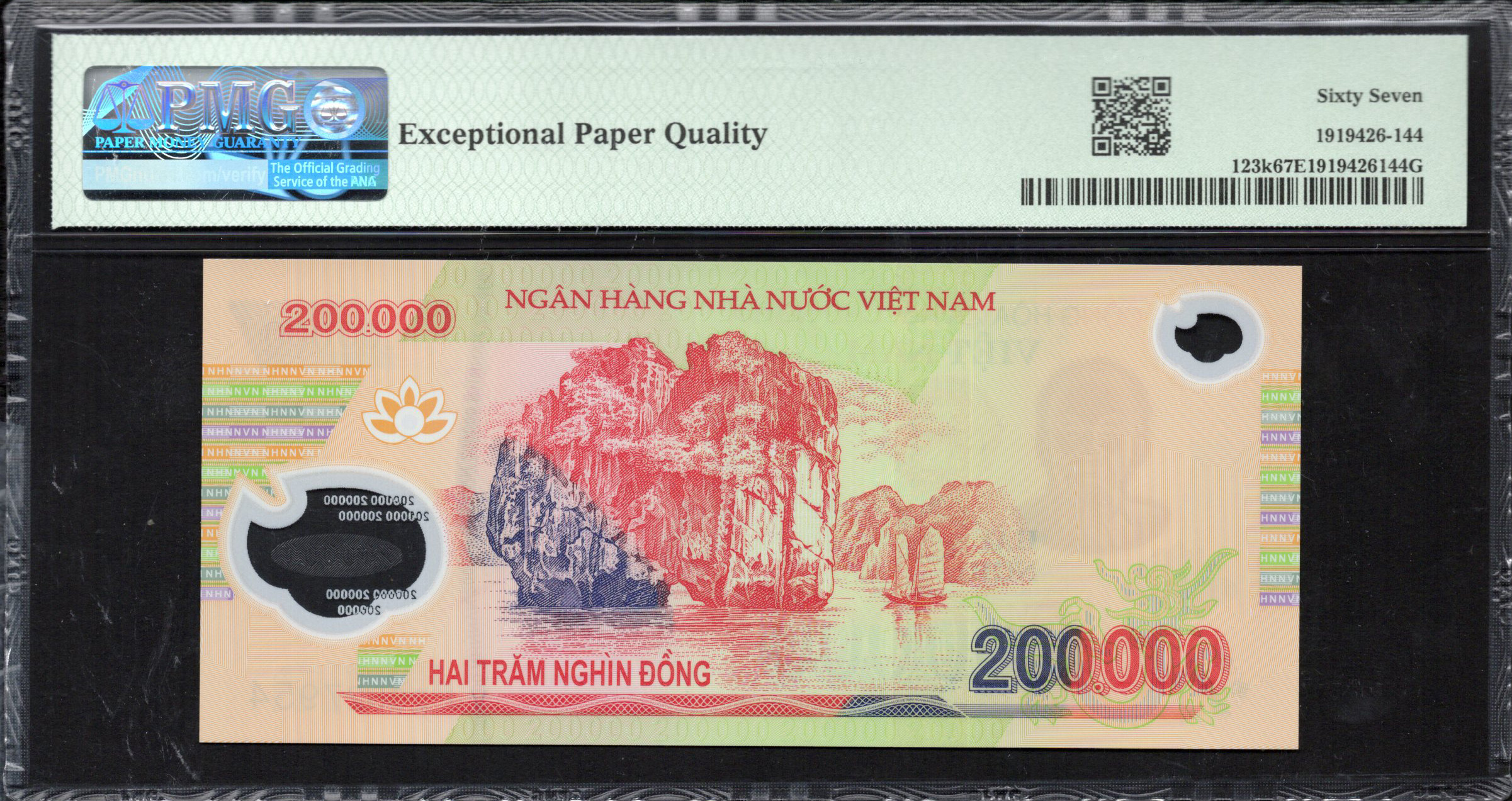 Het 200.000 Dong bankbiljet van Vietnam is een opvallende weergave van het rijke culturele erfgoed van het land. Uitgegeven in 2020 door de State Bank of Vietnam, heeft dit polymeren biljet levendige kleuren, ingewikkelde ontwerpen en geavanceerde veiligheidskenmerken. De voorzijde toont prominent een portret van Ho Chi Minh, een belangrijke figuur in de geschiedenis van Vietnam, samen met het nationale embleem en de denominatie.
