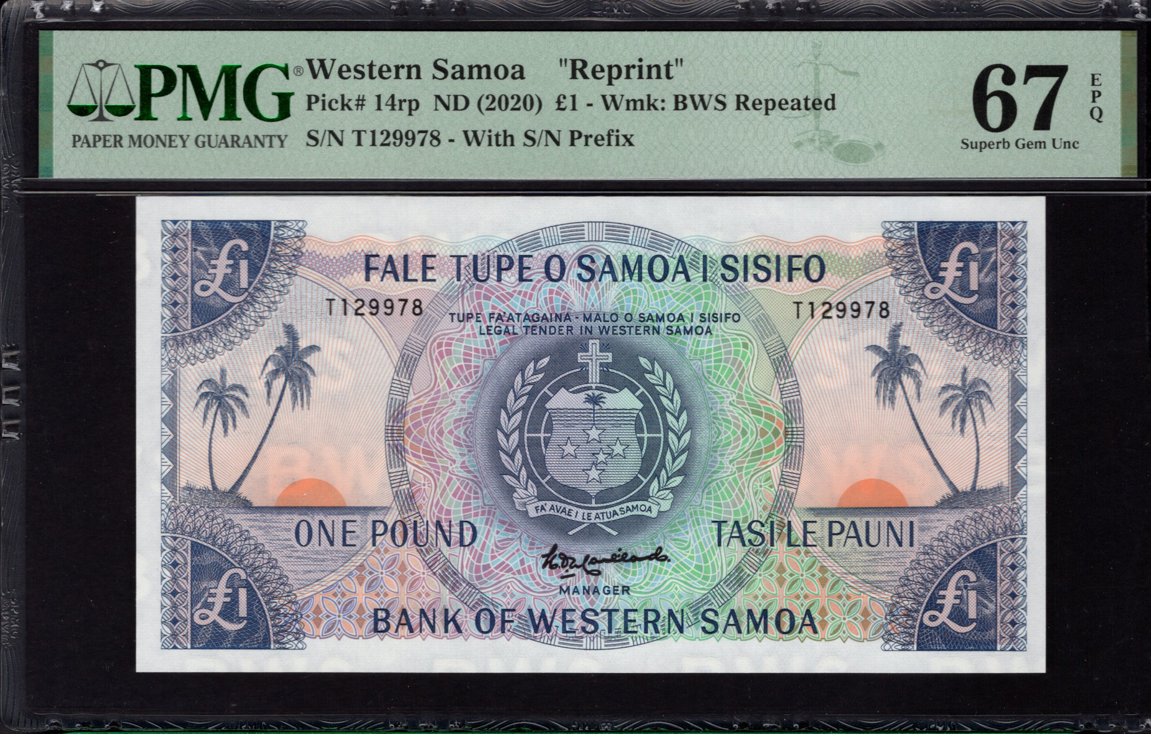 De voorkant van het bankbiljet toont prominent de waarde in vetgedrukte letters: 'EEN POND' onderaan, naast de Samoaanse zin 'TASILE PAUNI.' De afbeelding toont twee hoge palmbomen die de scène omlijsten, tegen een indrukwekkende zonsondergang, wat een warme sfeer creëert. Het watermerk en de microprinting zijn in het ontwerp geïntegreerd voor authenticiteit, terwijl ingewikkelde patronen zich langs de randen weven en de visuele complexiteit van het biljet verrijken. De kleuren, voornamelijk aqua blauw en oranje, harmoniseren met de natuurlijke motieven, en roepen een gevoel van rust en betekenis op dat inherent is aan de Samoaanse identiteit.