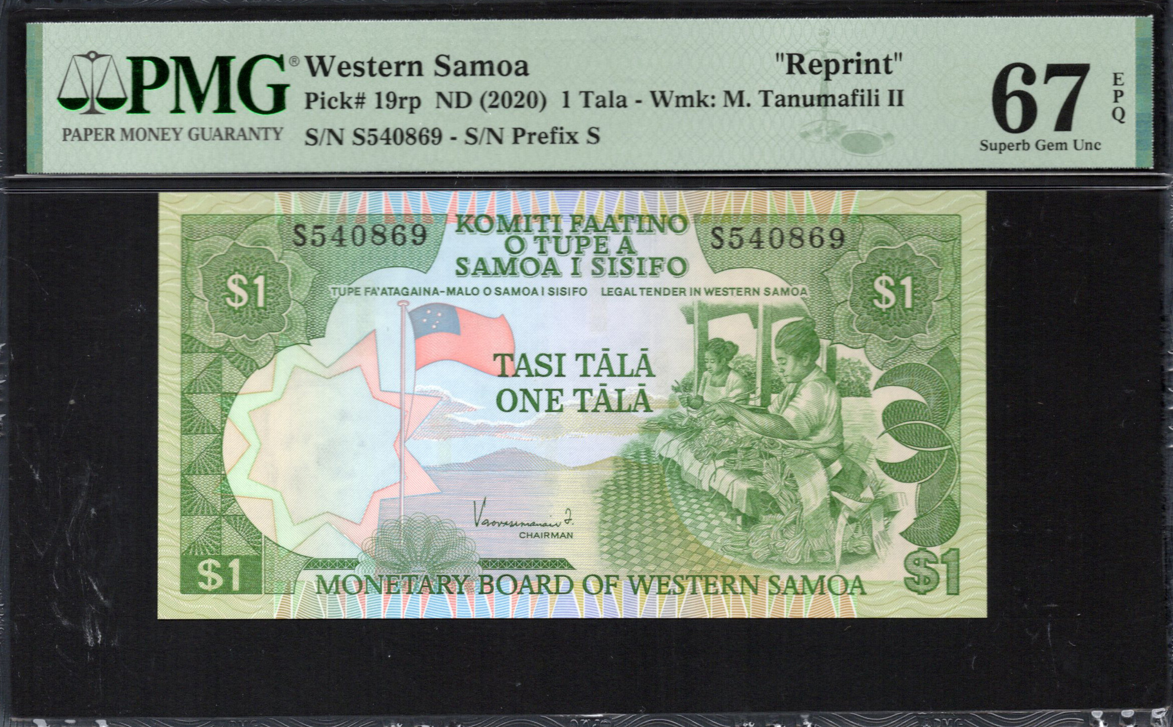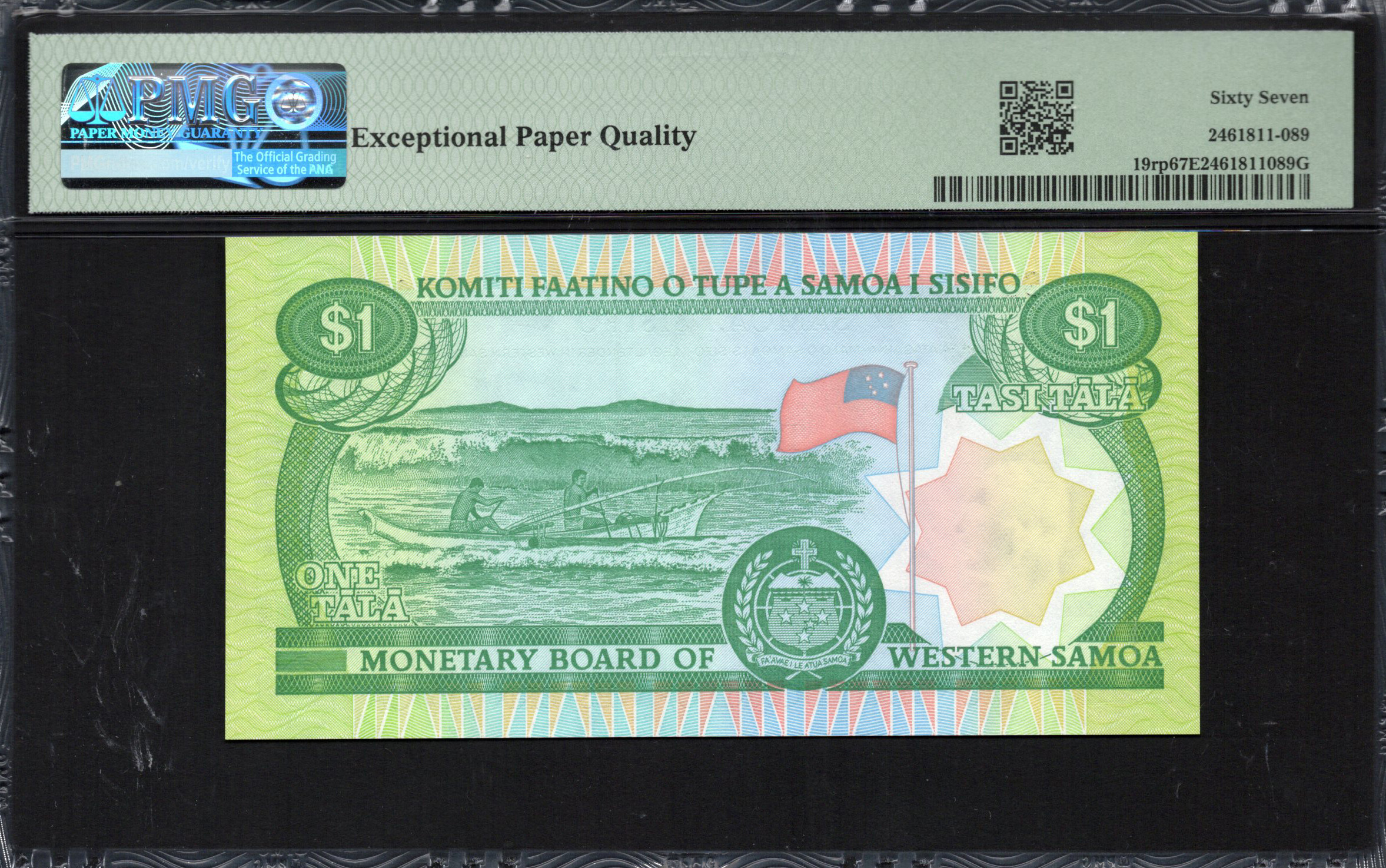 Het bankbiljet van $1 uit West-Samoa heeft opvallende beelden en belangrijke culturele verwijzingen. Dit specifieke biljet, gedrukt in levendige groentinten, toont de schoonheid en ambachtskunst die inherent is aan de Samoaanse cultuur. Met de nadruk op lokale tradities is het biljet zowel een stuk valuta als een kunstwerk, dat het belang onderstreept van het behoud van erfgoed door middel van kunst en monetaire representatie.