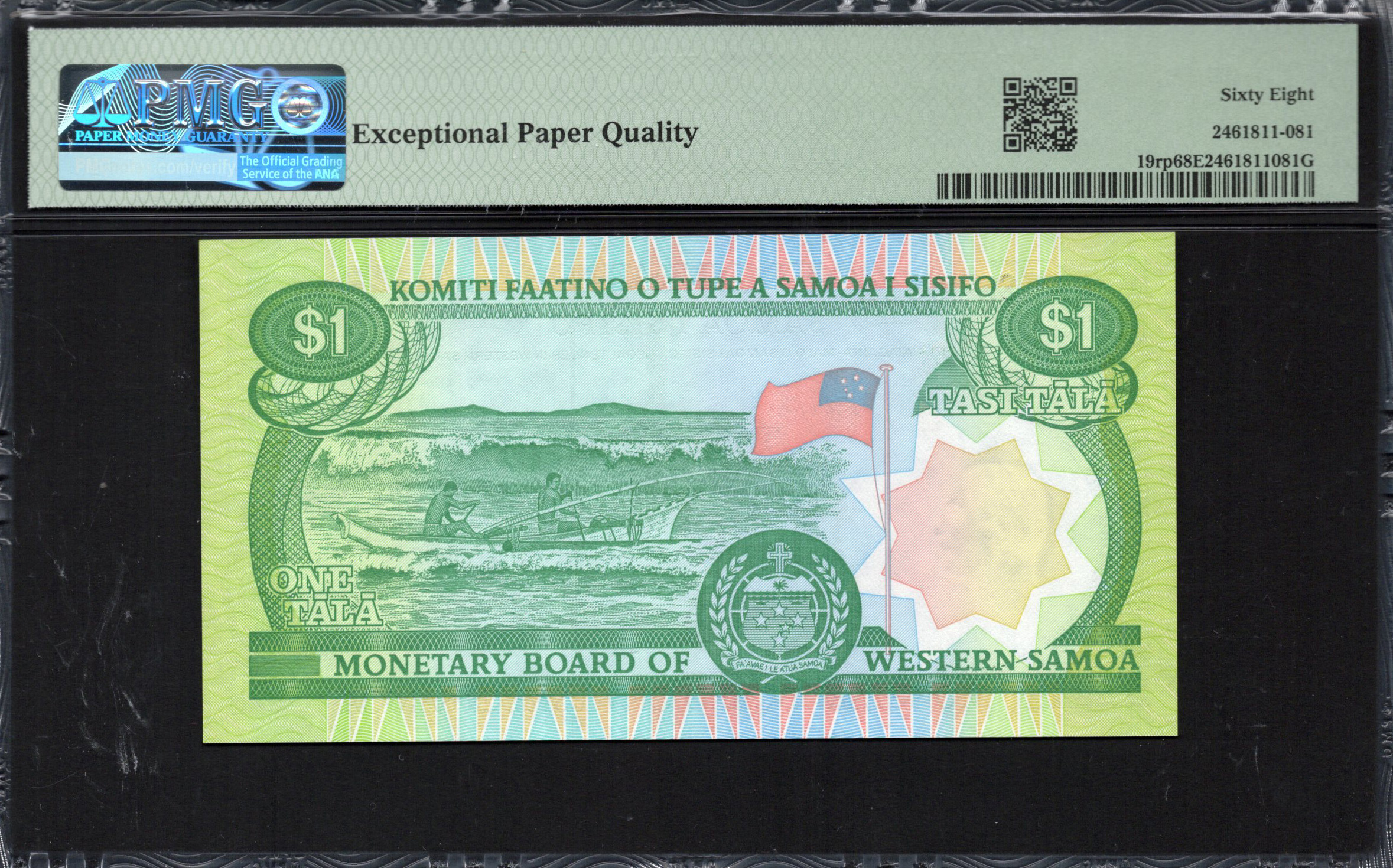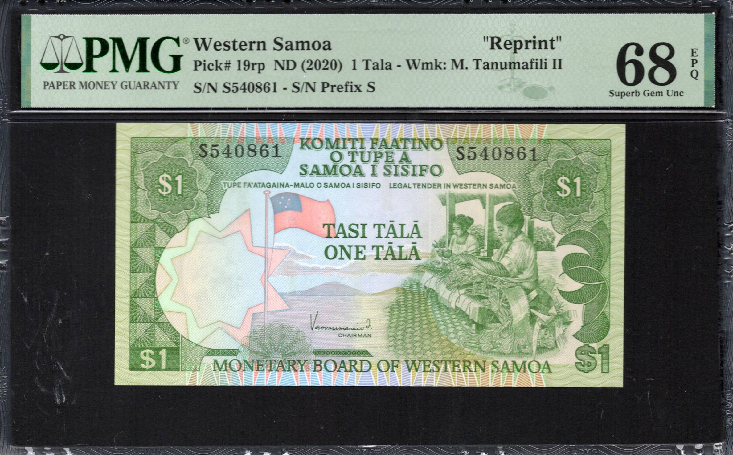 De voorkant van de $1 Tala toont een levendige afbeelding van twee vrouwen die betrokken zijn bij traditionele Samoa-weefkunst, wat de culturele betekenis van vakmanschap in de regio benadrukt. Op de achtergrond zijn ingewikkelde geometrische patronen en levendige kleuren te zien, voornamelijk tinten groen en roze. Op verschillende plaatsen staat het bedrag ‘$1’ prominent weergegeven, wat zorgt voor duidelijkheid. Het biljet bevat ook een reeks microteksten en een watermerk, wat de beveiliging verhoogt. De titel 'MONETARY BOARD OF WESTERN SAMOA' is duidelijk zichtbaar en bevestigt de wettige status.