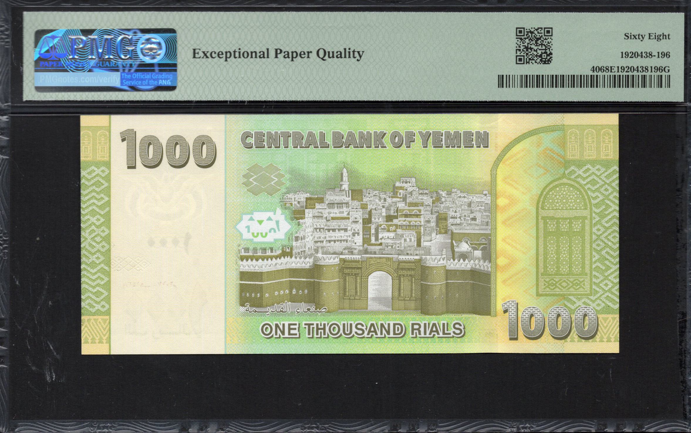 De voorzijde van het 1000 Riyal biljet toont een prominente afbeelding van een traditioneel Jemenitisch gebouw, met ingewikkelde architectonische elementen die de rijke cultuur en erfgoed van Jemen weerspiegelen. De achtergrond is versierd met patronen en een levendig groene kleur, naast de duidelijk weergegeven denominatie. Veiligheidskenmerken omvatten microdruk en mogelijk een watermerk om de authenticiteit te waarborgen. De ornamentale rand versterkt het gehele ontwerp en voegt een vleugje elegantie toe.
