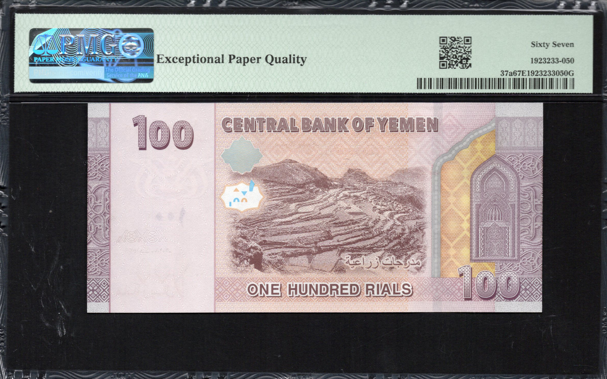 Aan de achterkant van het 100 Riyals bankbiljet vindt men meer ornamentale patronen, wat de esthetische waarde vergroot. De achtergrond is versierd met traditionele motieven, die de rijke erfgoed van Jemen illustreren. De waarde '100' is prominent weergegeven, aangevuld met extra veiligheidselementen, waaronder meer microtekst. Het kleurgebruik blijft consistent met de voorkant, met warme tinten die het erfgoed van het land symboliseren. Deze kant laat ook gedeeltelijke weergaven zien van opmerkelijke architectonische structuren, waarmee het verleden met het heden wordt verbonden.