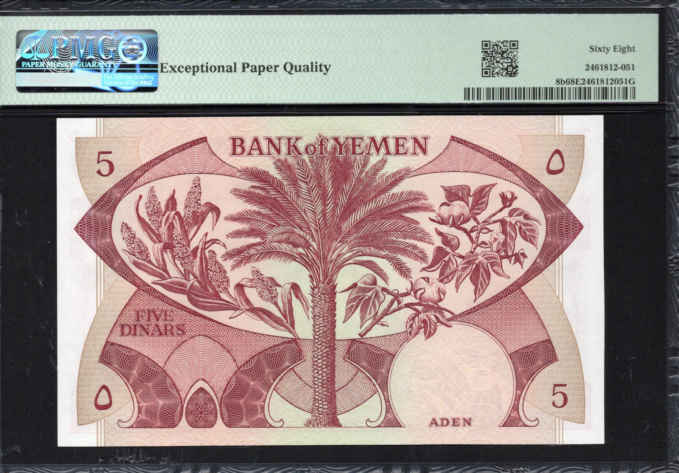 Het 5 Dinar bankbiljet van de Democratische Republiek Jemen is een levendig voorbeeld van culturele expressie door middel van valuta. Uitgegeven in 1984, is het biljet versierd met complexe ontwerpen die de erfgoed en schoonheid van de natuur van het land weerspiegelen. De voorkant toont een pittoresk landschap met traditionele boten die langs een rivier varen, tegen een achtergrond van golvende heuvels. De levendige kleuren en patronen benadrukken de kunstzinnigheid die kenmerkend is voor de Jemenitische cultuur. Opmerkelijk is dat het bankbiljet verschillende veiligheidskenmerken bevat, zoals watermerken en microtekst, die niet alleen de esthetische waarde verhogen, maar ook vervalsing helpen voorkomen. Dit bankbiljet dient zowel als ruilmiddel als een kunstwerk dat de geest van Jemen vastlegt.