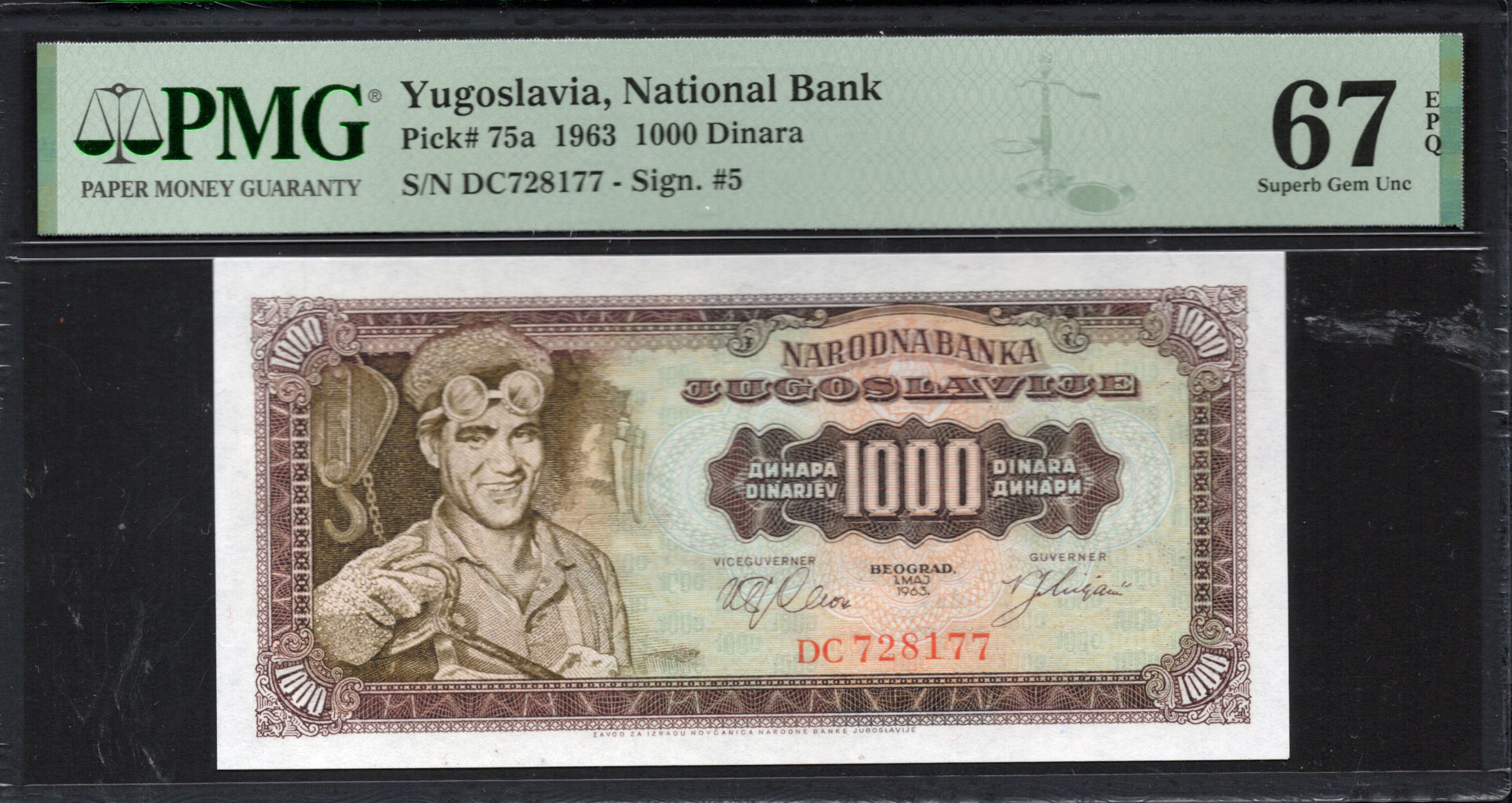Het 1000 dinar bankbiljet van Joegoslavië uit 1963 is een intrigerend stuk valuta dat de culturele en historische essentie van zijn tijd weerspiegelt. Met rijke kleuren en gedetailleerde illustraties vangt dit biljet zowel artistieke als praktische elementen. De voorkant toont een arbeider met een bril, wat staat voor industrie en innovatie, terwijl de achterkant ingewikkelde patronen en de nominale waarde benadrukt. Dit bankbiljet was opmerkelijk onderdeel van een overgangsperiode voor Joegoslavië, dat de economische en politieke ontwikkelingen weerspiegelt. Met een hoge beoordeling van 67 EPQ is het een voorbeeld van superieure vakmanschap en een gekoesterde verzamelobject voor numismatici.