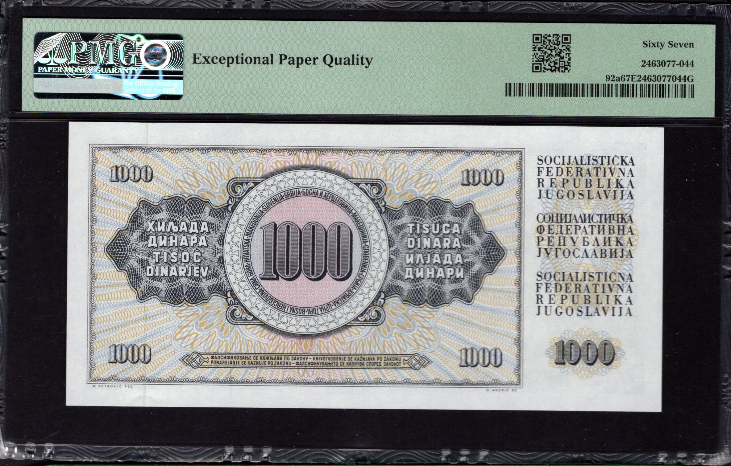 De voorzijde van het 1000 dinar bankbiljet toont een fijn gedetailleerd portret van een vrouw, emblematisch voor de Joegoslavische cultuur en agrarische identiteit. Haar uitdrukking weerspiegelt kracht en veerkracht, tegen de achtergrond van uitgestrekte landbouwgronden en wijnstokken. Het biljet maakt gebruik van een palet van zachte tinten en complexe lijnwerk, wat de artistieke waarde vergroot. Het biljet toont de nominale waarde '1000' in vetgedrukte cijfers, omringd door bloem- en geometrische patronen die elegantie toevoegen. Een watermerk is waarschijnlijk ingebed om de veiligheid te vergroten, evenals microtekst elementen die niet gemakkelijk zichtbaar zijn, maar bijdragen aan de authenticiteit.