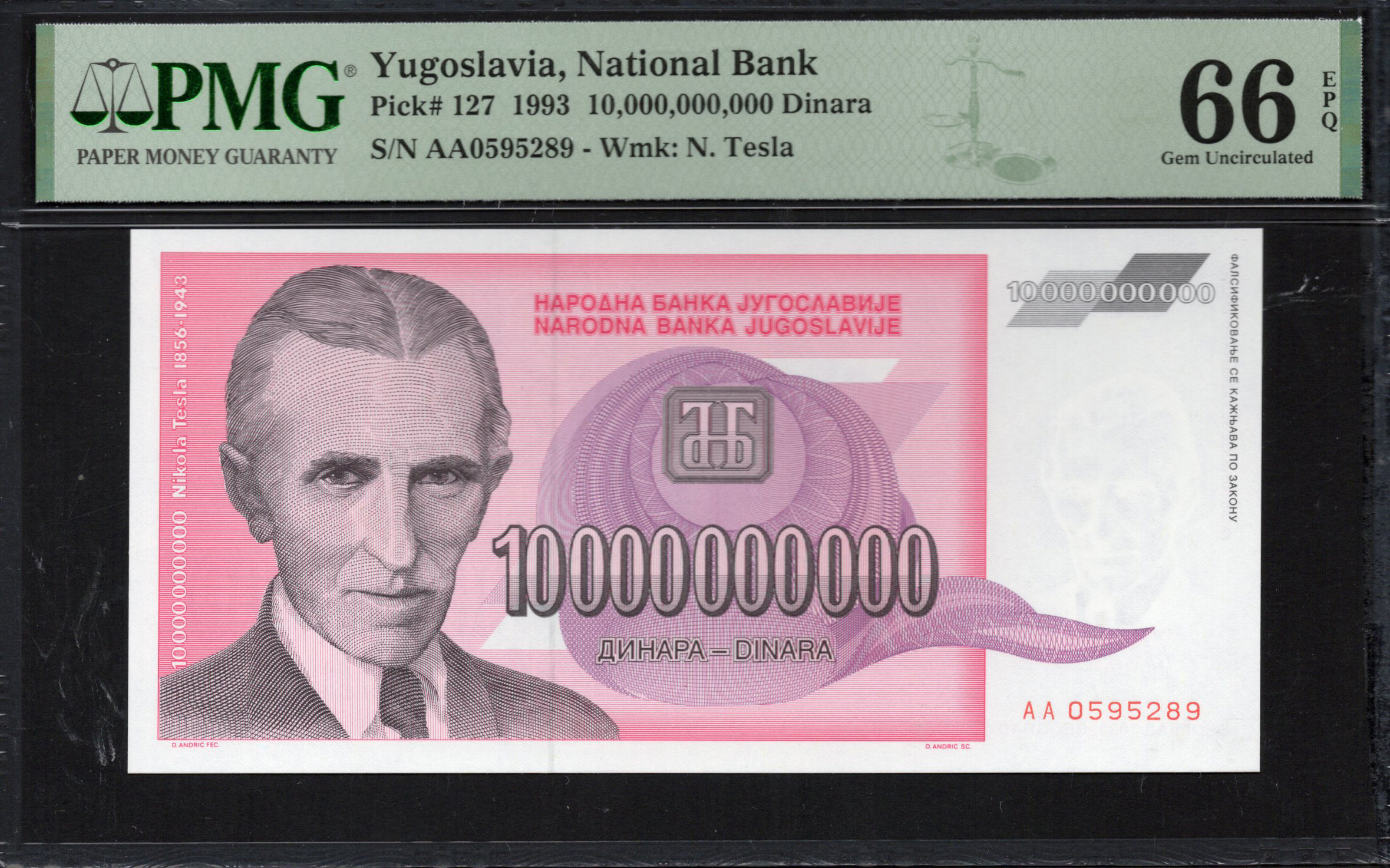 De voorkant van het bankbiljet toont prominent een gedetailleerd portret van Nikola Tesla, wat zijn bijdragen aan wetenschap en technologie benadrukt. De achtergrond heeft een mix van roze en witte tinten, aangevuld met decoratieve patronen die de visuele aantrekkingskracht vergroten. Er kunnen beveiligingskenmerken aanwezig zijn, zoals een watermerk en microtekst, hoewel deze niet allemaal zichtbaar zijn. De waarde van 10.000.000 dinar staat duidelijk aanwezig, samen met tekst in het Cyrillisch, wat de culturele betekenis van het biljet vergroot.