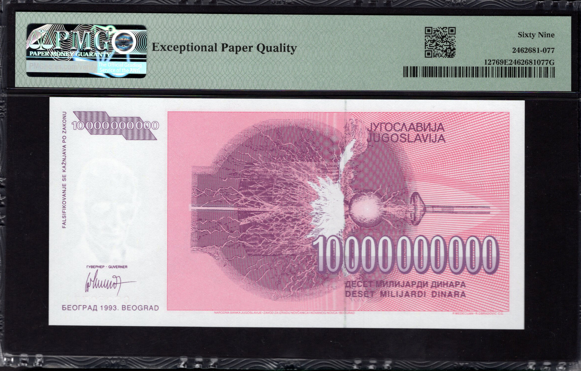 De voorzijde van het 10.000.000 Dinara bankbiljet toont prominent een gedetailleerd portret van Nikola Tesla, tegen een levendige roze achtergrond. Tesla's afbeelding is in een monochrome stijl weergegeven, wat zijn opvallende kenmerken benadrukt, zoals zijn gladde haar en bedachtzame uitstraling. Om hem heen bevinden zich decoratieve elementen, waaronder ornamentale patronen en de denominatie '10.000.000' in vetgedrukte typografie. Daarnaast bevat het bankbiljet tekst in het Cyrillisch schrift, wat de Joegoslavische oorsprong benadrukt. Subtiele watermerken en microtekst zijn vakkundig geïntegreerd om de beveiliging te verbeteren, wat de toewijding van de bank aan authenticiteit aantoont.