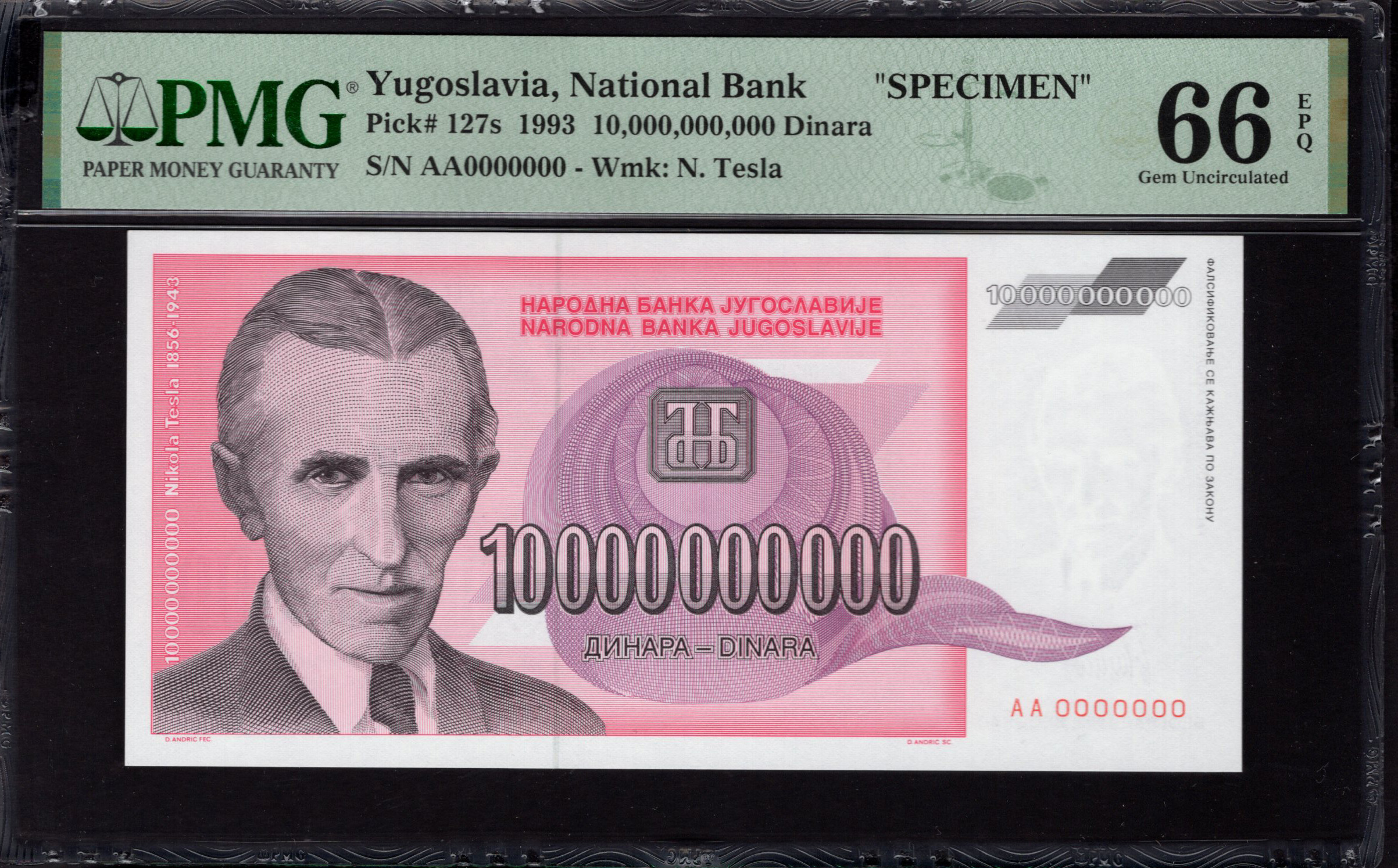 De voorzijde van het bankbiljet bevat een prominent portret van Nikola Tesla, afgebeeld met een serieuze uitdrukking die zijn intellectuele nalatenschap weerspiegelt. Om hem heen zijn verschillende decoratieve elementen, zoals ingewikkelde patronen die de artistieke kwaliteit van het biljet verbeteren. De overheersende roze kleurstelling, die ook geleidelijk van lichter naar donkerder overgaat, creƫert een visueel aantrekkelijk effect. Beveiligingskenmerken omvatten een watermerk van Tesla's afbeelding en micro-printing, die de legitimiteit waarborgen en vervalsen ontmoedigen. De denominatie '10.000.000' is duidelijk weergegeven, wat de waarde accentueert.