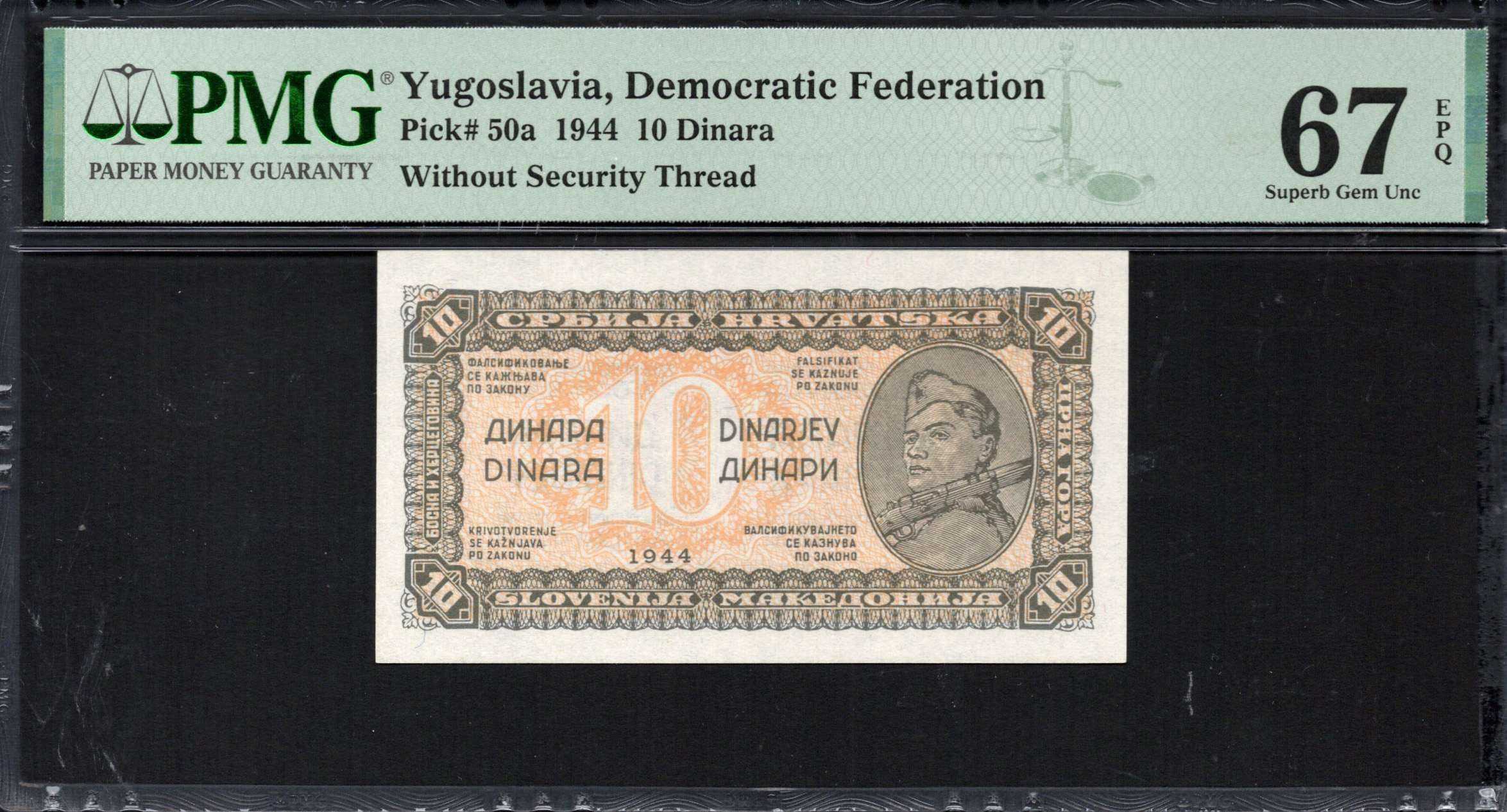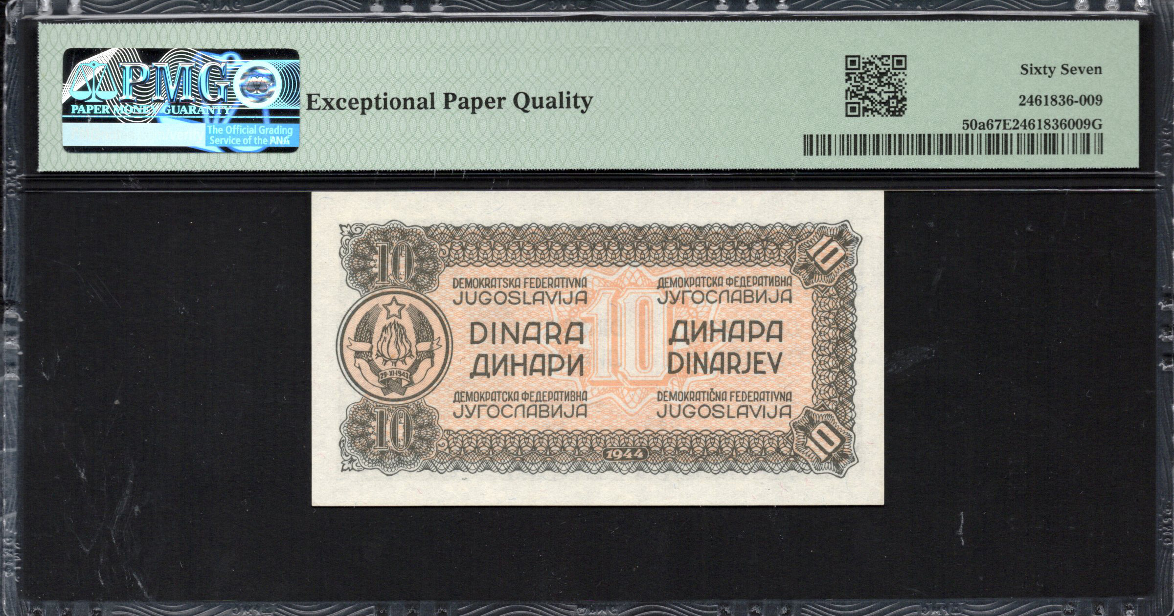 Dit bankbiljet van de Democratische Federatie van Joegoslaviƫ heeft een onderscheidend ontwerp en intrigerende details die de historische context weerspiegelen. Het 10 Dinara bankbiljet, uitgegeven in 1944, is van belang voor verzamelaars en historici en toont de artistieke en veiligheidskenmerken die typisch zijn voor die periode. De voorzijde van het biljet is voornamelijk licht van kleur, versierd met de nominaal als '10' en in Cyrillisch schrift. Vlaggen en ingewikkelde randversieringen omlijsten het centrale portret, wat inzicht geeft in de culturele symboliek van die tijd.
