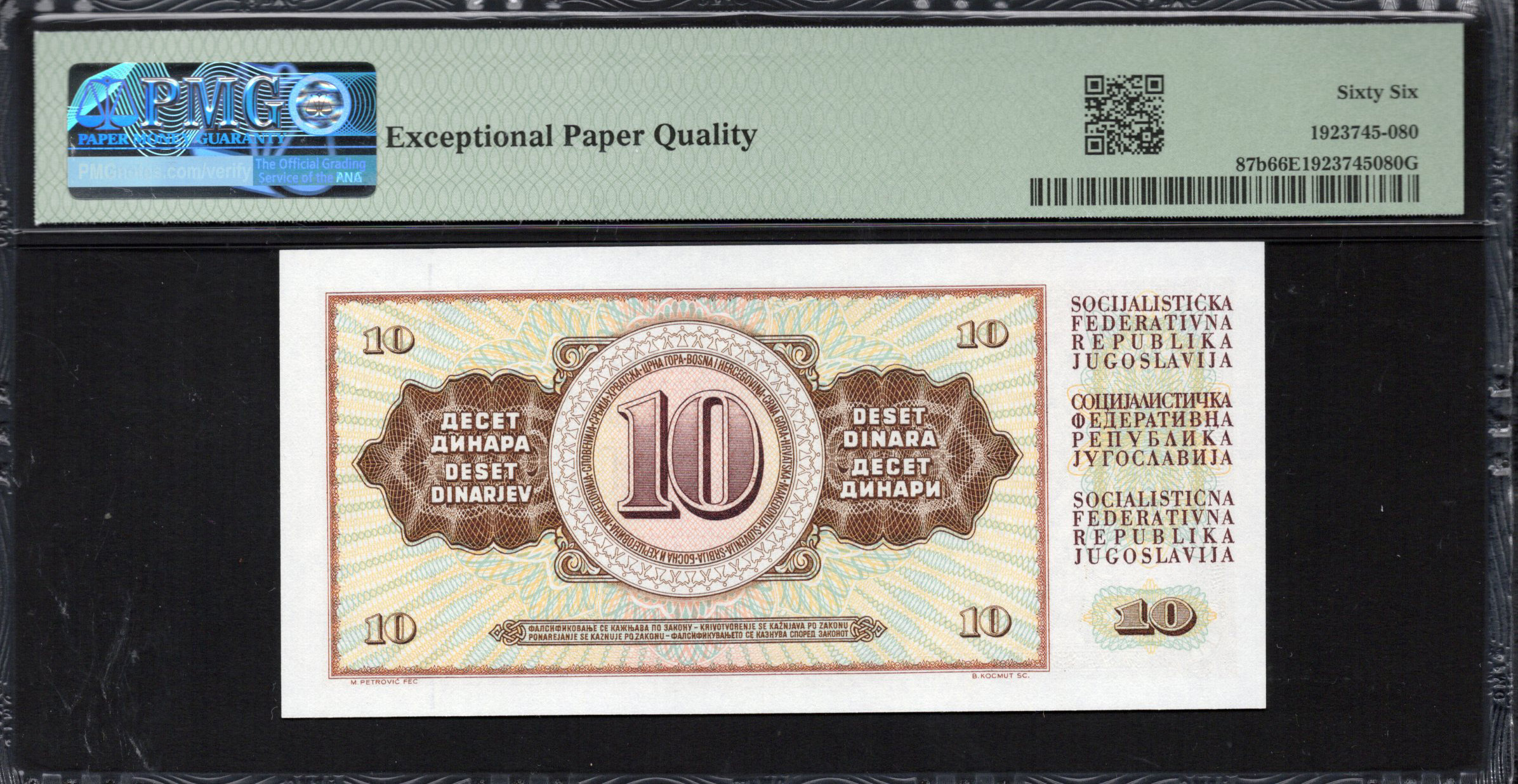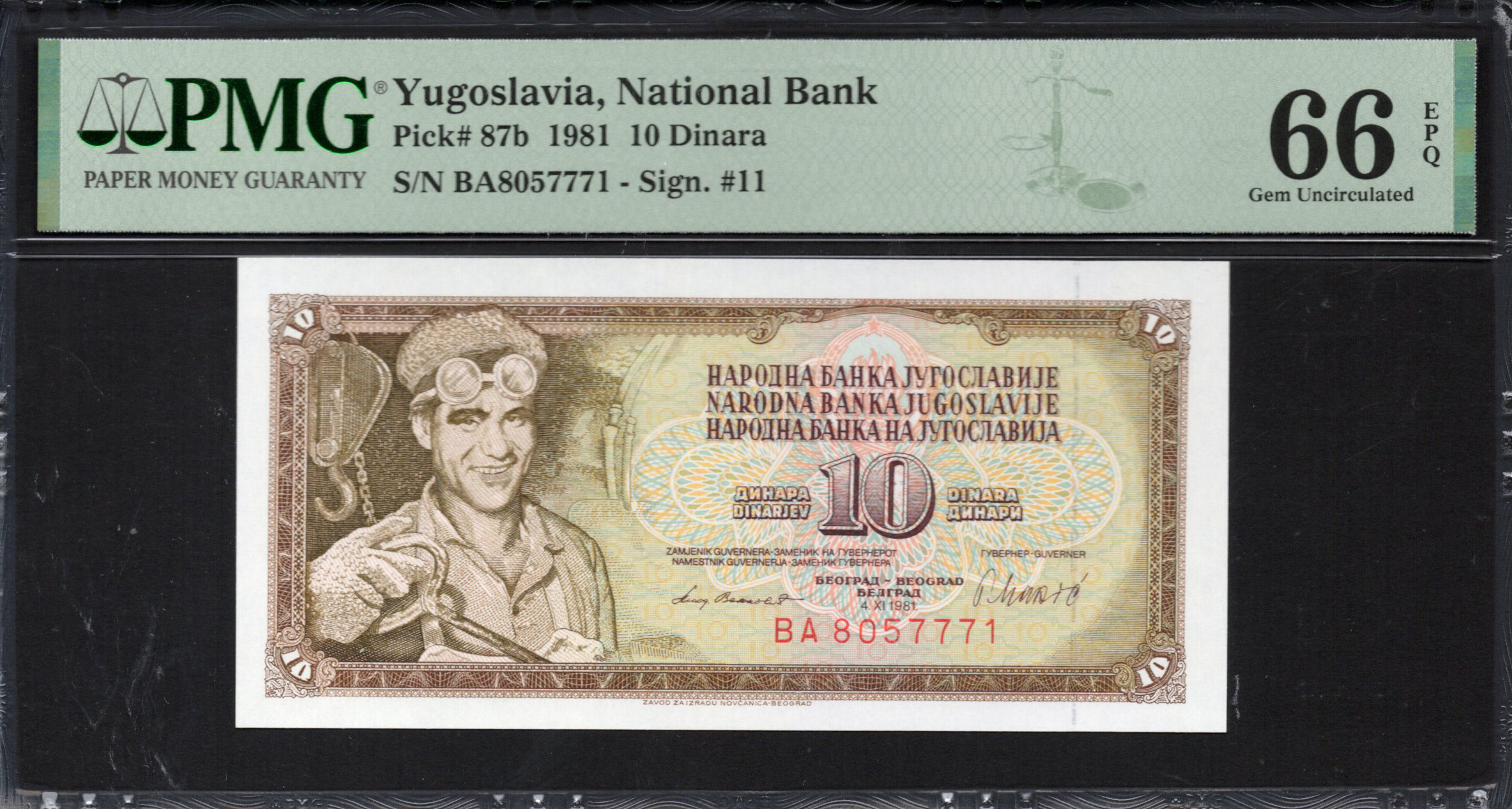 Dit Joegoslavische bankbiljet van 10 Dinara uit 1981 is een opmerkelijk stuk valuta uit die tijd, met interessante artistieke en beveiligingskenmerken. De voorzijde toont een portret van een glimlachende man met kenmerkende bril, die een gevoel van innovatie en industriële vooruitgang belichaamt. Rijke kleuren en ingewikkelde patronen sieren het bankbiljet, wat de kunstzinnigheid van het bankontwerp weerspiegelt. De achterzijde introduceert een ornamentaal ontwerp naast een prominente '10' denominatie, die de waarde ervan symboliseert. Dit bankbiljet dient niet alleen als een middel van betaling, maar ook als een representatie van het culturele erfgoed van Joegoslavië.