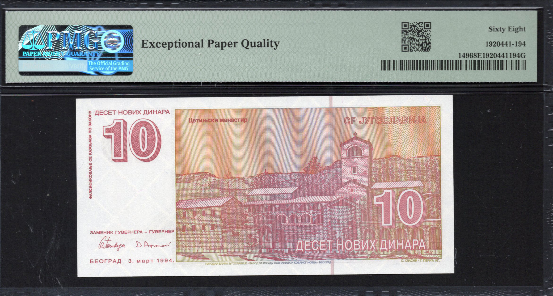 Dit bankbiljet van 10 Novih Dinara uit Joegoslavië, uitgegeven in 1994, weerspiegelt een rijke historische achtergrond door zijn complexe ontwerp en opmerkelijke figuren. De voorzijde toont een portret van Petar II Petrović Njegoš, een vereerde dichter en heerser in de Montenegrijnse geschiedenis, omringd door artistieke elementen die nationale trots vieren. De achterzijde illustreert een uniek ruitpatroon samen met de denominatie, wat de unieke kenmerken van het bankbiljet benadrukt en de toewijding aan veiligheid in bankbiljetontwerp benadrukt.