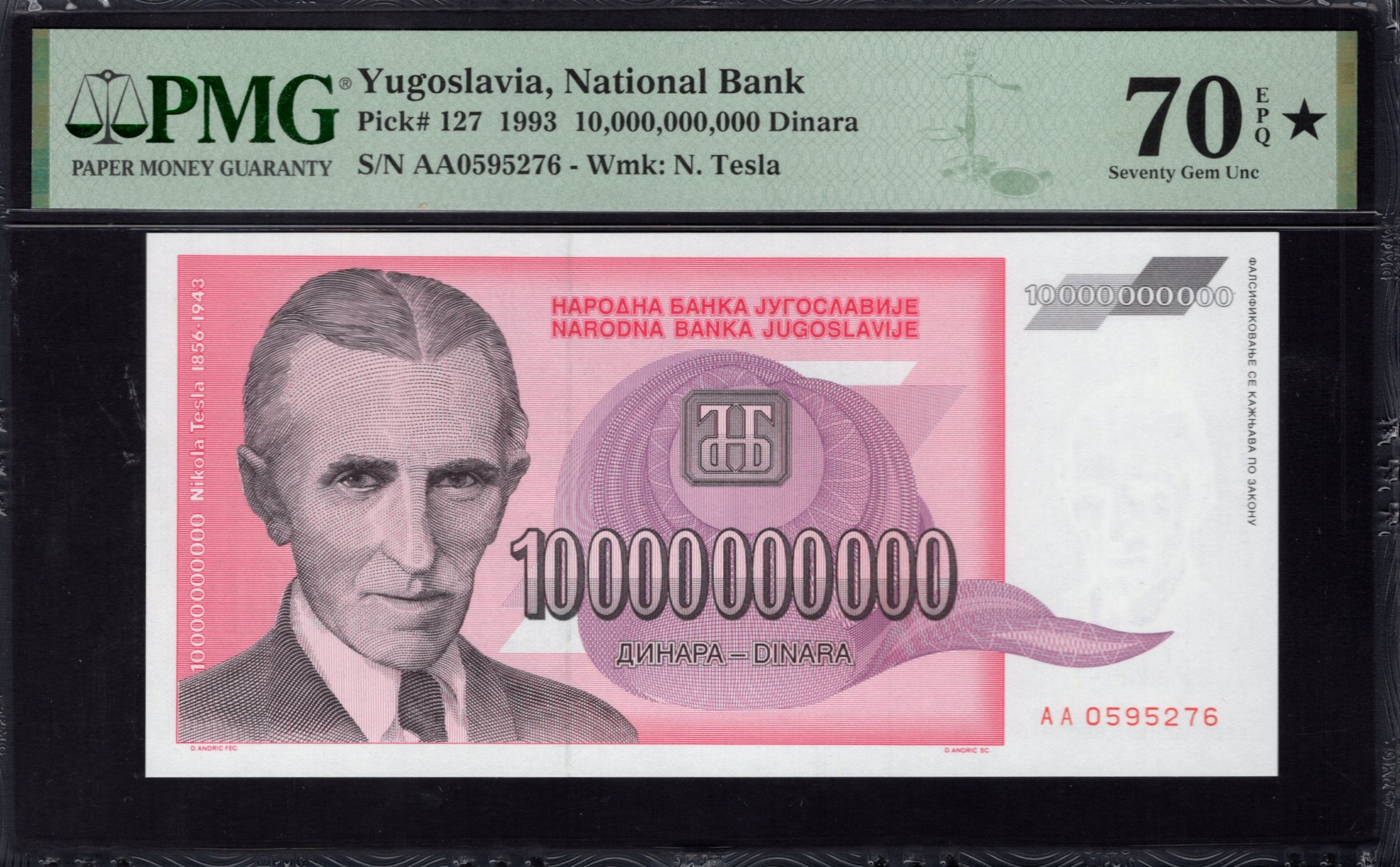De voorzijde van het bankbiljet toont prominent een gedetailleerd portret van Nikola Tesla, met zijn scherpe gelaatstrekken en karakteristieke haardracht. Een rijke roze kleur overheerst de achtergrond en creëert een elegante contrast met het beeld. Het bankbiljet bevat ingewikkelde ornamentale ontwerpen die de esthetische aantrekkingskracht verbeteren. Opvallend is dat het biljet beveiligingskenmerken bevat, zoals een watermerk en microtekst, bedoeld om vervalsing te voorkomen. De denominatie '10.000.000' is prominent weergegeven, waarmee de waarde duidelijk wordt gemaakt. De algehele compositie weerspiegelt zowel kunst als de doelstelling van nationale trots.