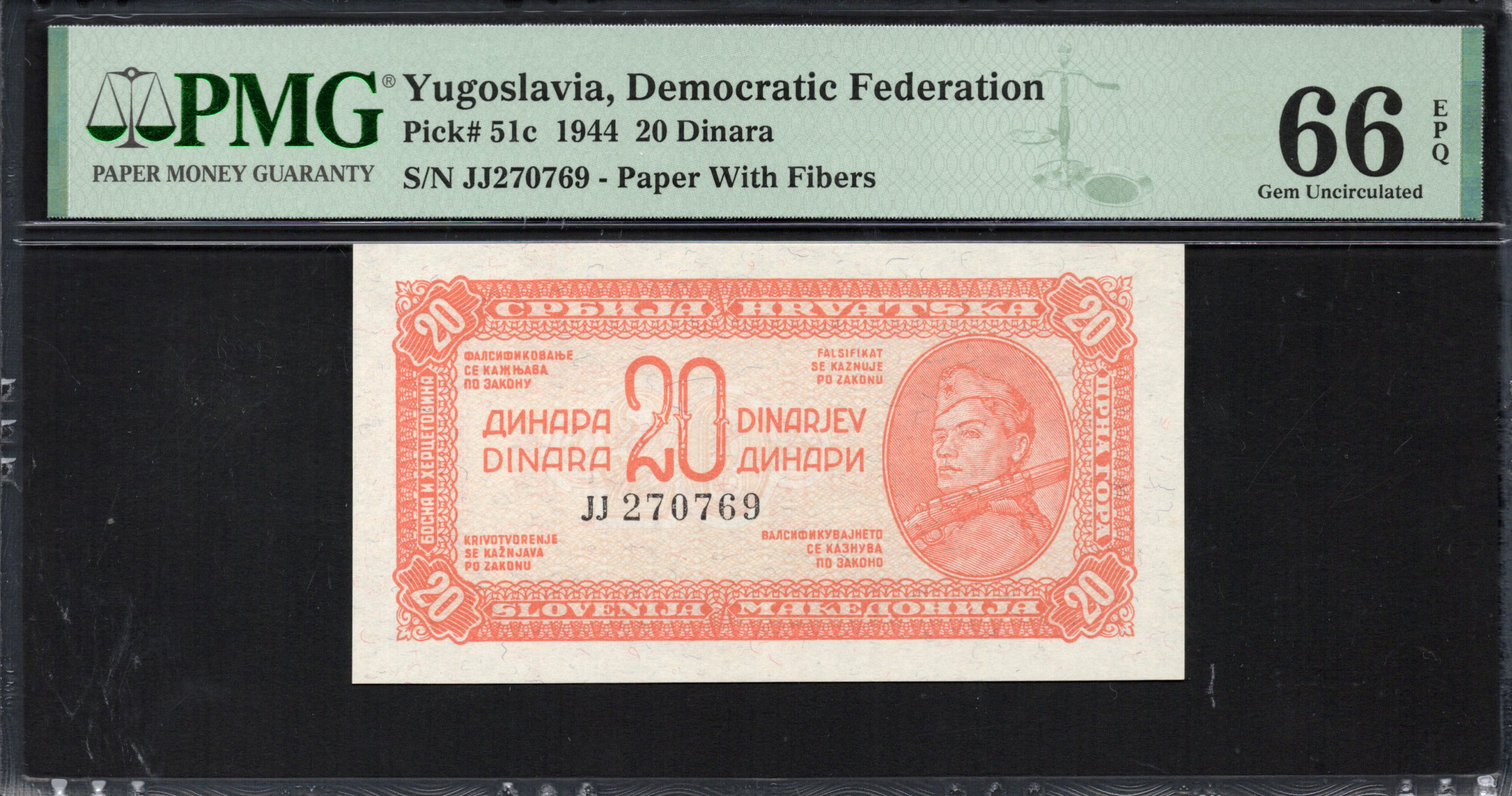 Dit Joegoslavische bankbiljet, uitgegeven in 1944, heeft intrigerende ontwerpen en historische betekenis. Als een biljet van 20 dinar weerspiegelt het de kunst en vakmanschap van zijn tijd, terwijl het cruciale inzichten biedt in de erfenis van de Joegoslavische Democratische Federatie. Het biljet toont een portret van een belangrijke figuur uit die tijd, tegen een levendige oranje achtergrond, wat de veerkracht en geest van de natie symboliseert. Bovendien bevat het biljet verschillende tekstelementen in het Cyrillische schrift, die duidelijk de denominatie en contextuele informatie definiƫren. Deze combinatie van artistiek en functioneel ontwerp maakt het een fascinerend stuk voor verzamelaars en historici.