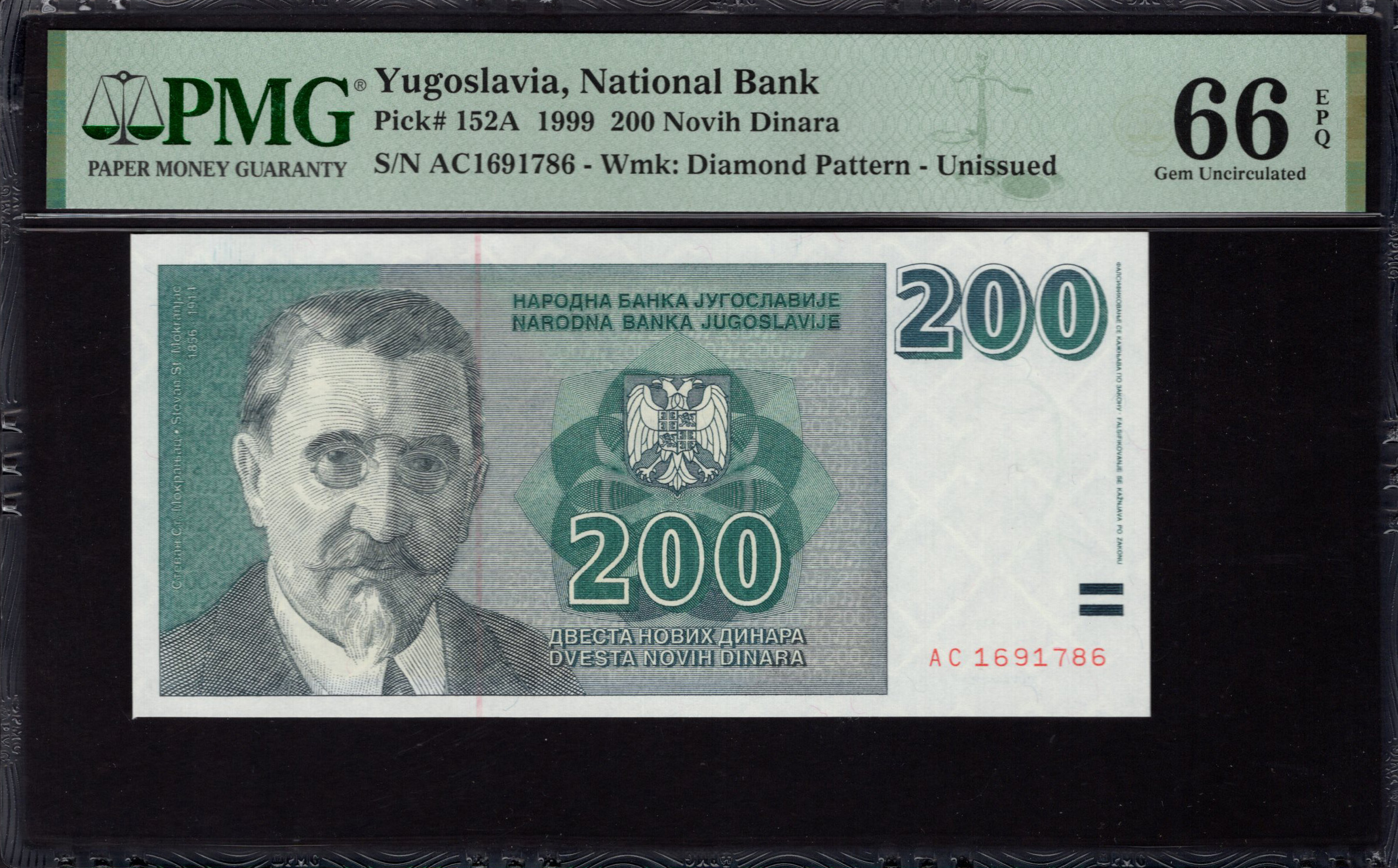 Dit bankbiljet van 200 Novi Dinara uit 1999 van Joegoslavië valt op door zijn ingewikkelde ontwerp en beveiligingskenmerken. De voorkant toont een onderscheiden portret, wat de historische betekenis versterkt. Het gebruik van groene tinten, samen met gedetailleerde gravures, exemplificeert de kunstzinnigheid van bankbiljetontwerpen. Het bankbiljet bevat beveiligingselementen zoals een watermerk en micro-print om vervalsing te voorkomen, wat het een fascinerend stuk maakt voor verzamelaars en historici.