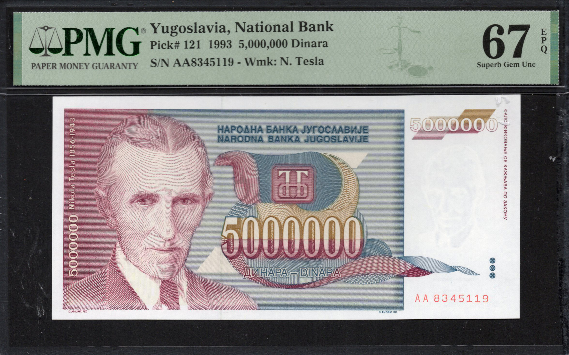 Dit Joegoslavische bankbiljet, uitgegeven door de Nationale Bank in 1993 en ter waarde van 5.000.000 dinar, toont de beroemde uitvinder Nikola Tesla. Het ontwerp bevat ingewikkelde patronen en een palette van pasteltinten, wat de visuele aantrekkingskracht vergroot. Het bankbiljet bevat verschillende veiligheidskenmerken, waaronder een watermerk van Tesla's profiel en microtekst voor authenticiteit, waardoor het zowel een verzamelobject als een veilige munt is.