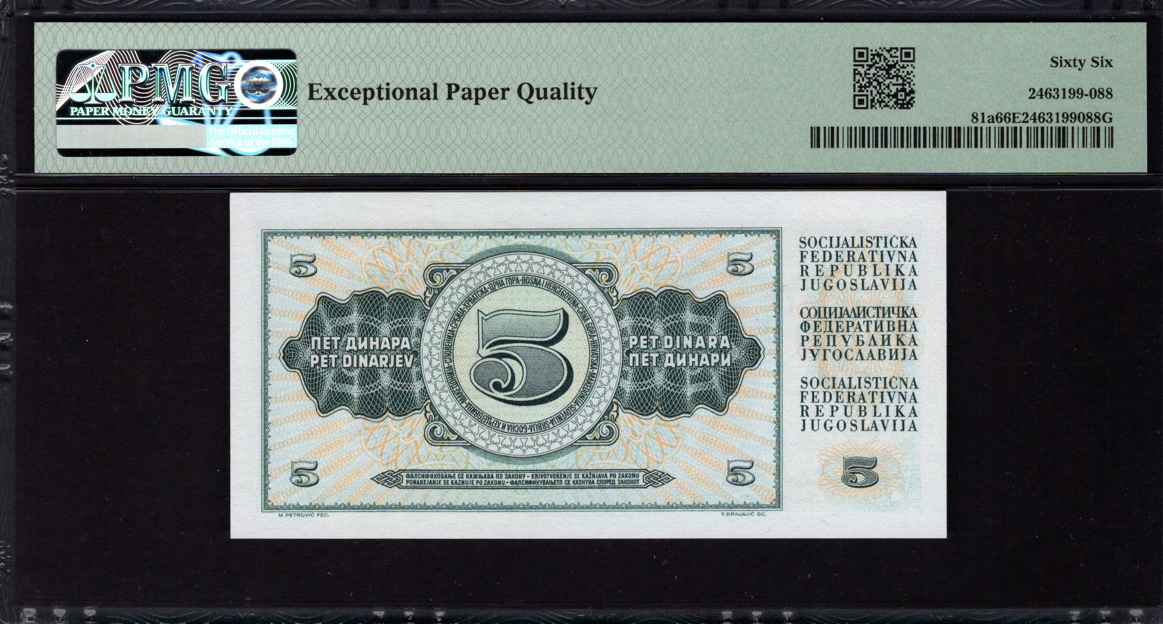 De achterzijde van het 5 Dinar bankbiljet is evenzeer weelderig, met complexe patronen die zowel esthetisch aantrekkelijk als indicatief zijn voor het ambacht van die tijd. De denominatie '5 Dinar' is prominent aanwezig, vergezeld van stijlvolle versieringen in groene en witte tinten, wat de kunstzinnigheid verder versterkt. Elementen zoals microtekst en complexe patronen dienen een dubbele functie: ze voegen schoonheid toe en fungeren ook als veiligheidskenmerken. Het ontwerp weerspiegelt een toewijding aan zowel kunst als functionaliteit, waardoor het biljet niet alleen valuta is, maar ook een representatie van de Joegoslavische cultuur.
