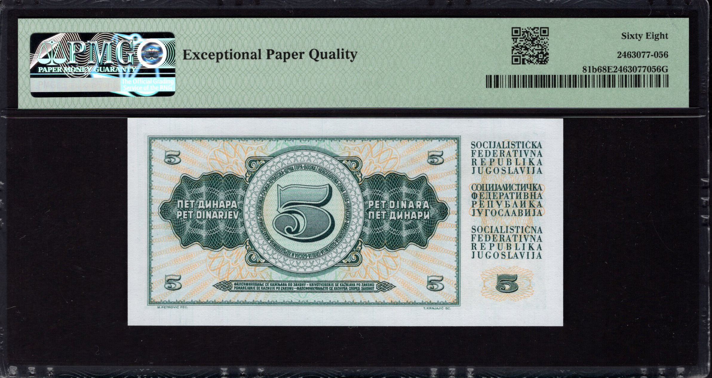 De achterzijde van het bankbiljet toont complexe ornamentale patronen in combinatie met een duidelijk aangegeven waarde van '5 dinara'. De achtergrond sluit aan bij de voorzijde met een voortzetting van de groene tinten, wat een continuïteit in het ontwerp belichaamt. Unieke elementen zoals bloemmotieven en geometrische patronen dienen zowel artistieke als antinagefabricage doeleinden. Bovendien vertoont het bankbiljet essentiële tekst in het Servisch-Cyrillisch, wat de nationale betekenis benadrukt. Het algehele ontwerp straalt de harmonie tussen kunst en valuta uit en is een levendig voorbeeld van de Joegoslavische cultuur uit die tijd. De artistieke details in combinatie met veiligheidskenmerken benadrukken de betekenis van dit bankbiljet.