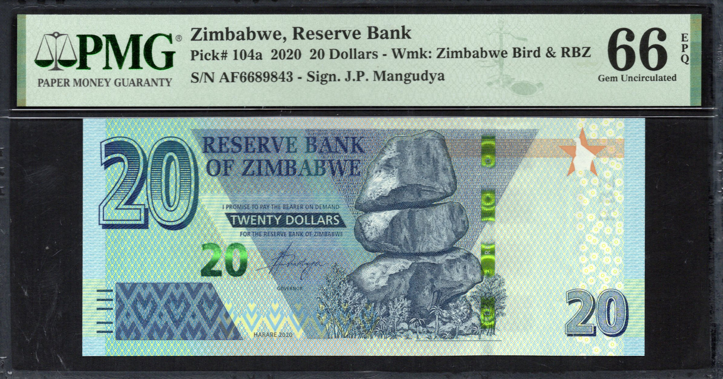 De voorzijde van het bankbiljet toont prominent de waarde '20' in grote, vetgedrukte cijfers. De achtergrond is versierd met verschillende tinten blauw en groen, wat een levendige maar rustgevende visuele aantrekkingskracht biedt. De tekst 'RESERVE BANK OF ZIMBABWE' is elegant geschreven, wat legitimiteit biedt, terwijl de afbeelding van stenen sculpturen culturele betekenis toevoegt. Beveiligingskenmerken zoals een watermerk zijn zichtbaar, wat de authenticiteit waarborgt tegen vervalsing.