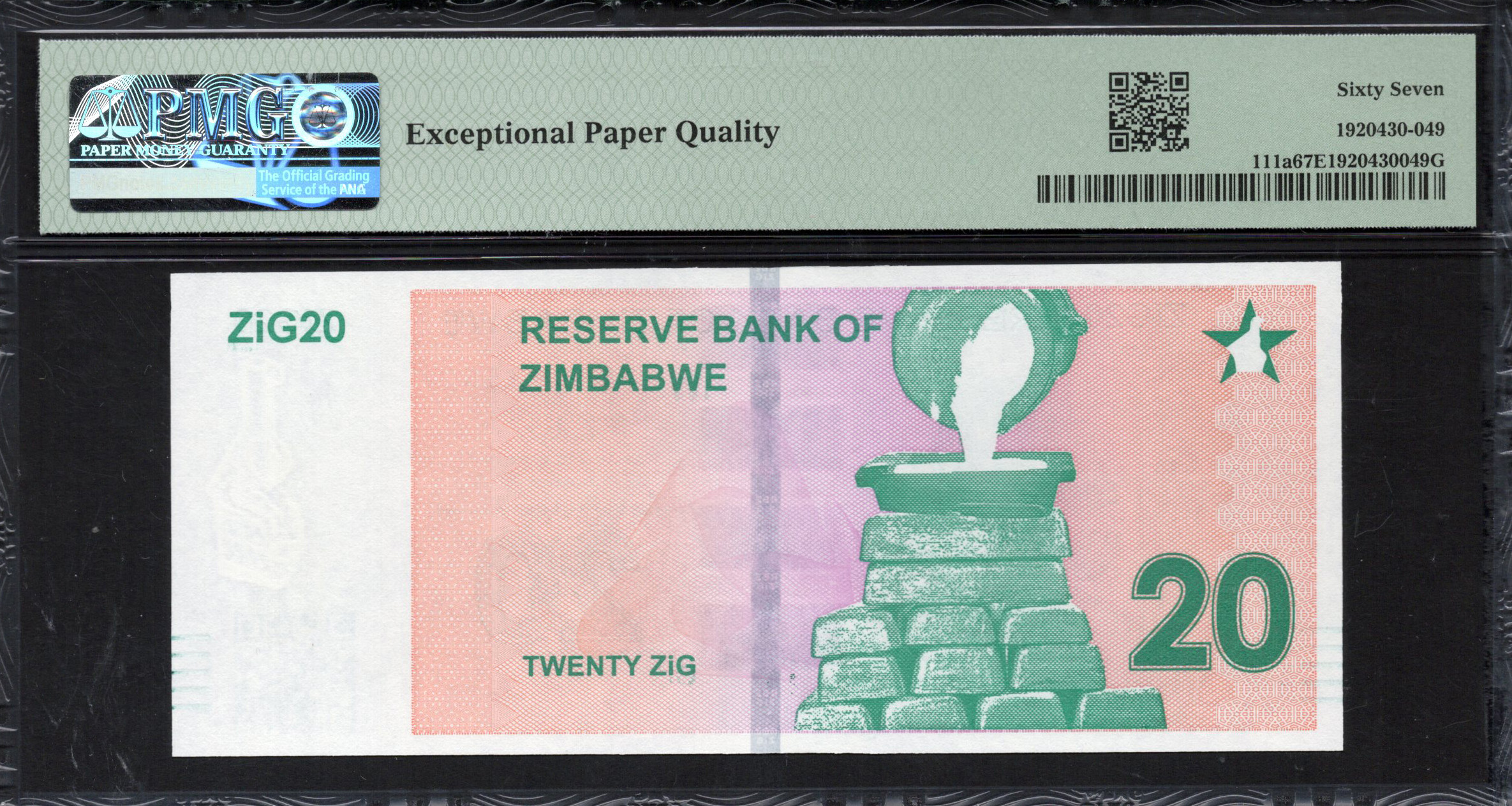 Dit bankbiljet is een levendige en complexe weergave van het Zimbabweaanse currenciesysteem, dat zowel zijn culturele erfgoed als moderne beveiligingskenmerken weerspiegelt. Uitgegeven door de Reserve Bank of Zimbabwe, bevat dit 20-dollarbiljet verschillende artistieke elementen die nationale trots symboliseren. Het ontwerp integreert slim de Zimbabwe Bird, een nationaal embleem, samen met een opvallende kleurenpalet van roze en groen. De verfijnde beveiligingselementen waarborgen de integriteit van de valuta en verbeteren de waarde en betrouwbaarheid ervan.