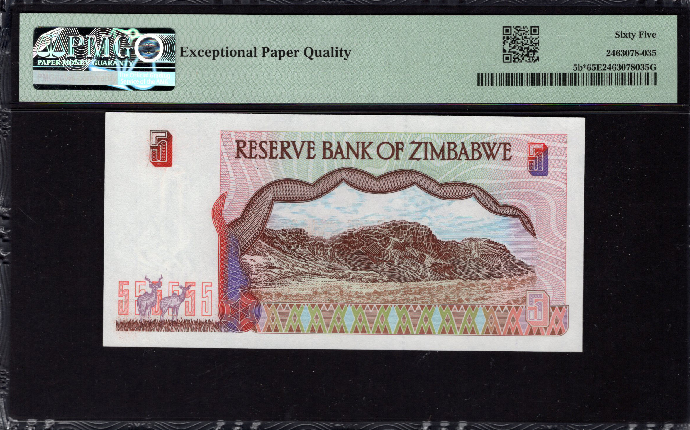 De voorzijde van het vijfdollarbiljet toont duidelijk de woorden "RESERVE BANK OF ZIMBABWE" bovenaan. Daaronder staat een grote afbeelding van gestapelde stenen, die de ruïnes van Groot-Zimbabwe vertegenwoordigen, omringd door intrigerende patronen en ontwerpen. Het levendige kleurenpalet, met roze, lichtblauw en donkerdere tinten, geeft een gevoel van diepte en artistieke flair. De denominatie "FIVE DOLLARS" is duidelijk zichtbaar, met aanvullende beveiligingskenmerken zoals een watermerk en microprint die de echtheid waarborgen.