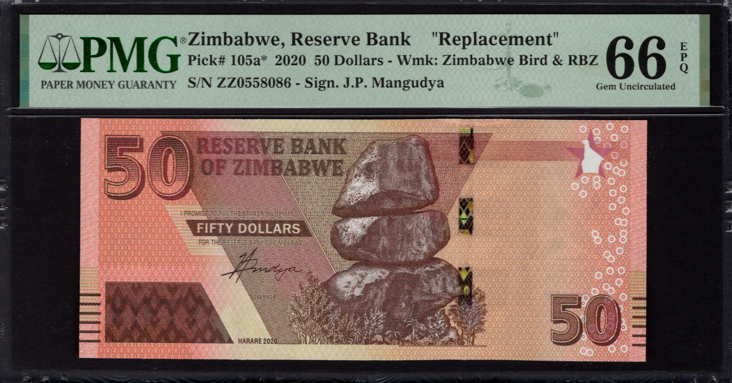 Het Zimbabwaanse bankbiljet, specifiek het 50 dollarbiljet uit 2020, heeft duidelijke artistieke en veiligheidskenmerken die wijzen op zijn oorsprong en functie. De voorzijde toont een stapel stenen, wat stabiliteit en veerkracht symboliseert, tegen een levendige gradient van rode en oranje tinten. Het biljet bevat de nominale waarde duidelijk weergegeven, samen met de naam van de Reserve Bank of Zimbabwe. Veiligheidskenmerken zoals microtekst en een watermerk zijn subtiel geïntegreerd in het ontwerp om vervalsing te voorkomen, wat de legitimiteit van het biljet waarborgt.