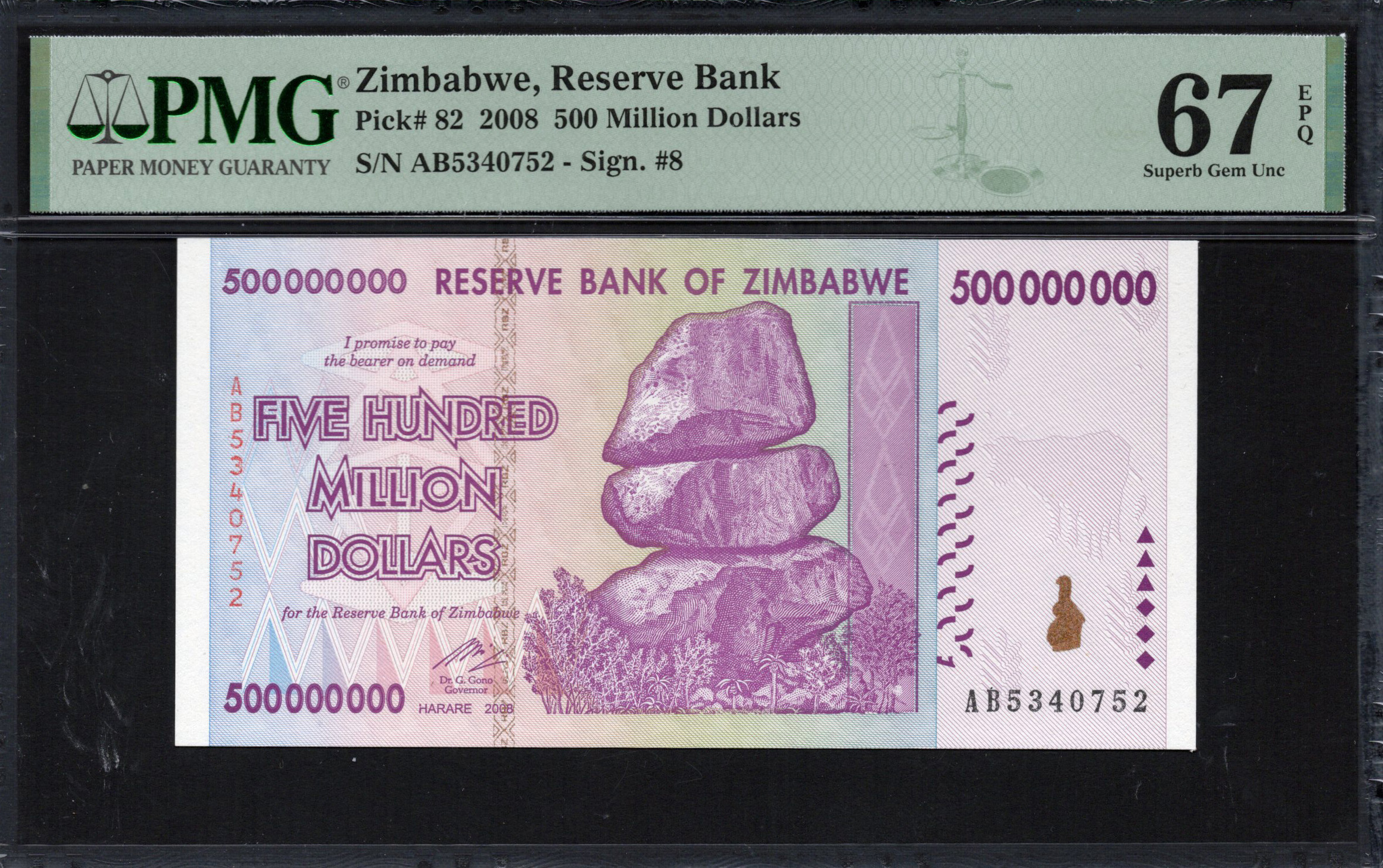 De voorzijde van het bankbiljet presenteert een levendig kleurenpalet, voornamelijk in paarse en groene tinten. De prominente tekst 'FIVE HUNDRED MILLION DOLLARS' staat centraal en geeft duidelijk de waarde aan. Onder de denominatie staat de belofte om aan de houder te betalen, een klassieke functie op bankbiljetten. Deze zijde bevat ook ingewikkelde ontwerpen, waaronder gestileerde rotsformaties en bladeren die het natuurlijke milieu van Zimbabwe symboliseren. Daarnaast kunnen subtiele beveiligingskenmerken zoals microprint en een watermerk zorgen voor bescherming tegen vervalsing.